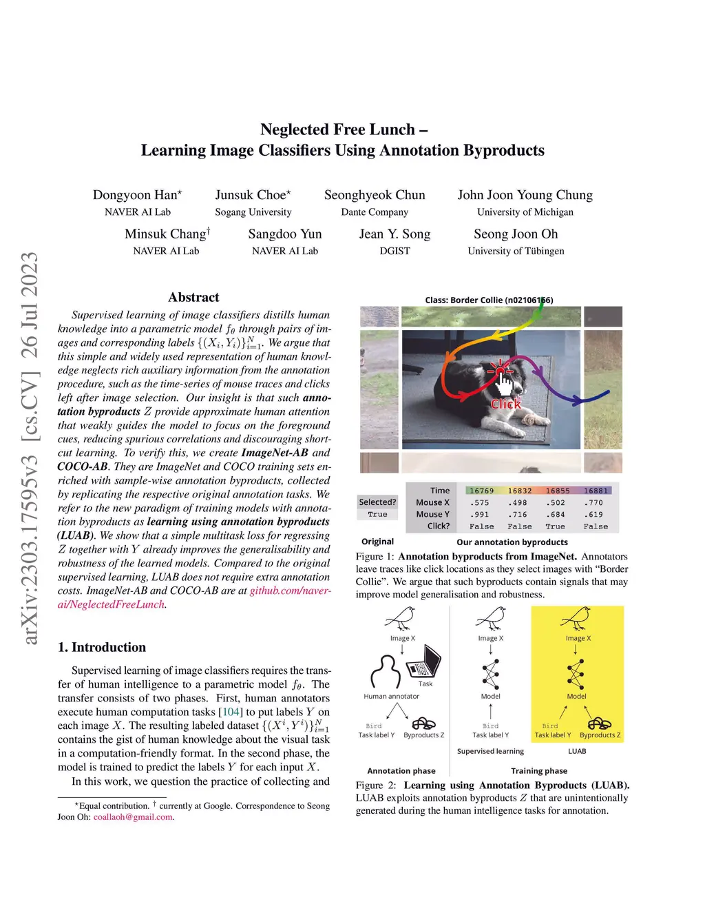 Supervised learning of image classifiers distills human knowledge into a parametric model through pairs of images and corresponding labels (X,Y). We argue that this simple and widely used representation of human knowledge neglects rich auxiliary information from the annotation procedure, such as the time-series of mouse traces and clicks left after image selection. Our insight is that such annotation byproducts Z provide approximate human attention that weakly guides the model to focus on the foreground cues, reducing spurious correlations and discouraging shortcut learning. To verify this, we create ImageNet-AB and COCO-AB. They are ImageNet and COCO training sets enriched with sample-wise annotation byproducts, collected by replicating the respective original annotation tasks. We refer to the new paradigm of training models with annotation byproducts as learning using annotation byproducts (LUAB). We show that a simple multitask loss for regressing Z together with Y already improves the generalisability and robustness of the learned models. Compared to the original supervised learning, LUAB does not require extra annotation costs. ImageNet-AB and COCO-AB are at https://github.com/naver-ai/NeglectedFreeLunch.