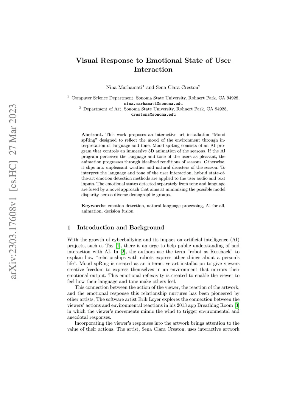 This work proposes an interactive art installation "Mood spRing" designed to reflect the mood of the environment through interpretation of language and tone. Mood spRing consists of an AI program that controls an immersive 3D animation of the seasons. If the AI program perceives the language and tone of the users as pleasant, the animation progresses through idealized renditions of seasons. Otherwise, it slips into unpleasant weather and natural disasters of the season. To interpret the language and tone of the user interaction, hybrid state-of-the-art emotion detection methods are applied to the user audio and text inputs. The emotional states detected separately from tone and language are fused by a novel approach that aims at minimizing the possible model disparity across diverse demographic groups.