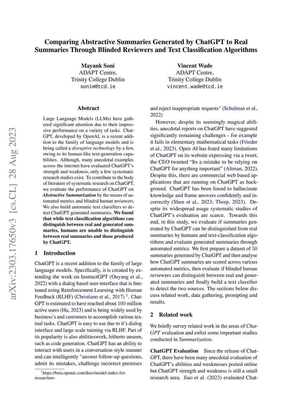 Large Language Models (LLMs) have gathered significant attention due to their impressive performance on a variety of tasks. ChatGPT, developed by OpenAI, is a recent addition to the family of language models and is being called a disruptive technology by a few, owing to its human-like text-generation capabilities. Although, many anecdotal examples across the internet have evaluated ChatGPT's strength and weakness, only a few systematic research studies exist. To contribute to the body of literature of systematic research on ChatGPT, we evaluate the performance of ChatGPT on Abstractive Summarization by the means of automated metrics and blinded human reviewers. We also build automatic text classifiers to detect ChatGPT generated summaries. We found that while text classification algorithms can distinguish between real and generated summaries, humans are unable to distinguish between real summaries and those produced by ChatGPT.