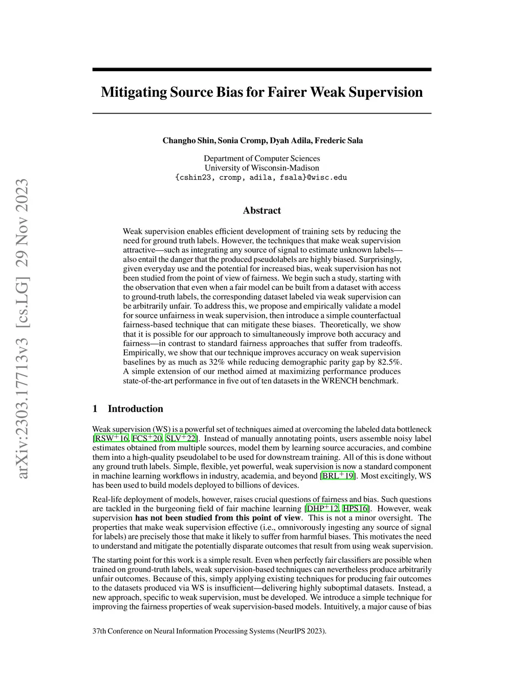 Weak supervision enables efficient development of training sets by reducing the need for ground truth labels. However, the techniques that make weak supervision attractive -- such as integrating any source of signal to estimate unknown labels -- also entail the danger that the produced pseudolabels are highly biased. Surprisingly, given everyday use and the potential for increased bias, weak supervision has not been studied from the point of view of fairness. We begin such a study, starting with the observation that even when a fair model can be built from a dataset with access to ground-truth labels, the corresponding dataset labeled via weak supervision can be arbitrarily unfair. To address this, we propose and empirically validate a model for source unfairness in weak supervision, then introduce a simple counterfactual fairness-based technique that can mitigate these biases. Theoretically, we show that it is possible for our approach to simultaneously improve both accuracy and fairness -- in contrast to standard fairness approaches that suffer from tradeoffs. Empirically, we show that our technique improves accuracy on weak supervision baselines by as much as 32\% while reducing demographic parity gap by 82.5\%. A simple extension of our method aimed at maximizing performance produces state-of-the-art performance in five out of ten datasets in the WRENCH benchmark.