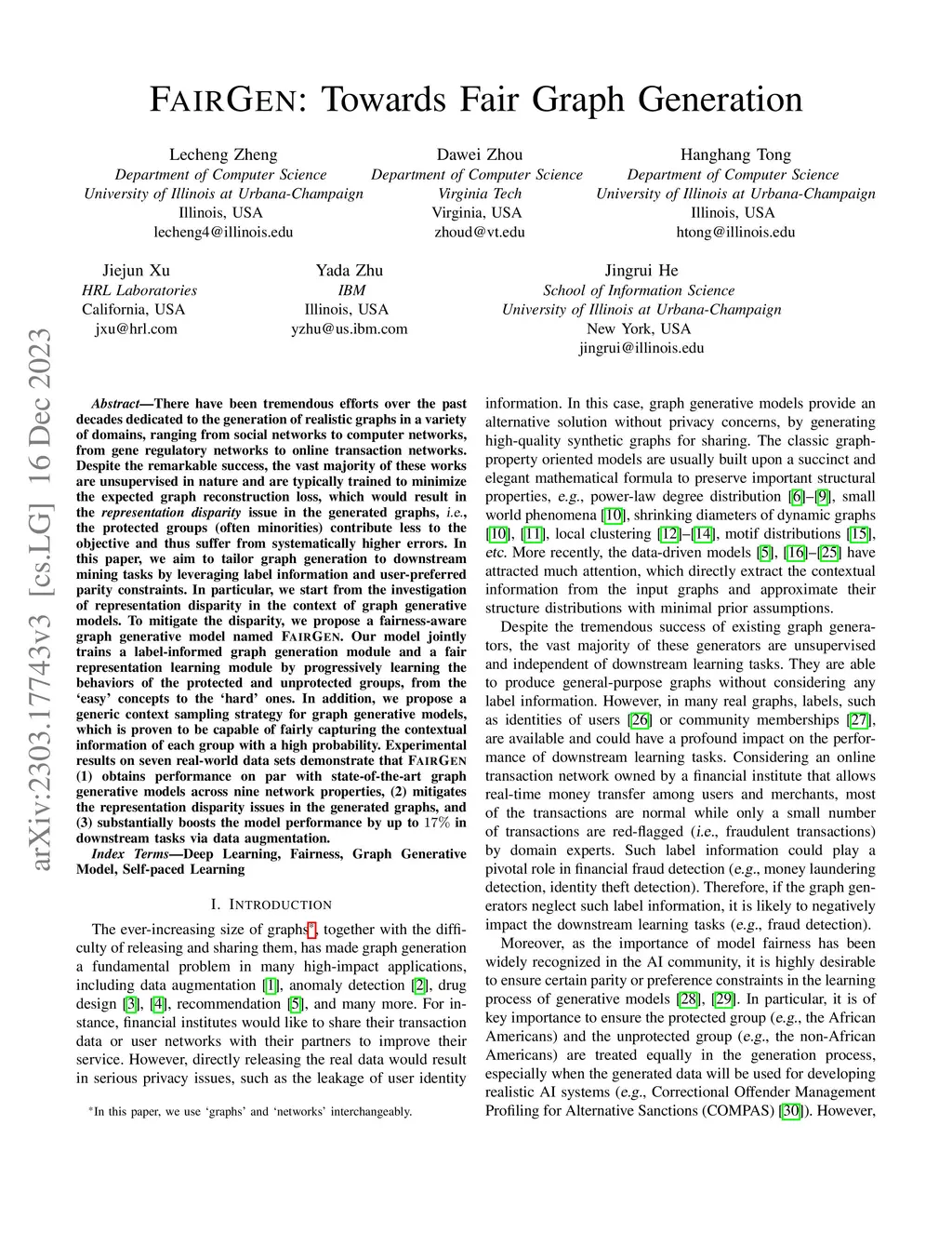 There have been tremendous efforts over the past decades dedicated to the generation of realistic graphs in a variety of domains, ranging from social networks to computer networks, from gene regulatory networks to online transaction networks. Despite the remarkable success, the vast majority of these works are unsupervised in nature and are typically trained to minimize the expected graph reconstruction loss, which would result in the representation disparity issue in the generated graphs, i.e., the protected groups (often minorities) contribute less to the objective and thus suffer from systematically higher errors. In this paper, we aim to tailor graph generation to downstream mining tasks by leveraging label information and user-preferred parity constraints. In particular, we start from the investigation of representation disparity in the context of graph generative models. To mitigate the disparity, we propose a fairness-aware graph generative model named FairGen. Our model jointly trains a label-informed graph generation module and a fair representation learning module by progressively learning the behaviors of the protected and unprotected groups, from the `easy' concepts to the `hard' ones. In addition, we propose a generic context sampling strategy for graph generative models, which is proven to be capable of fairly capturing the contextual information of each group with a high probability. Experimental results on seven real-world data sets, including web-based graphs, demonstrate that FairGen (1) obtains performance on par with state-of-the-art graph generative models across nine network properties, (2) mitigates the representation disparity issues in the generated graphs, and (3) substantially boosts the model performance by up to 17% in downstream tasks via data augmentation.
