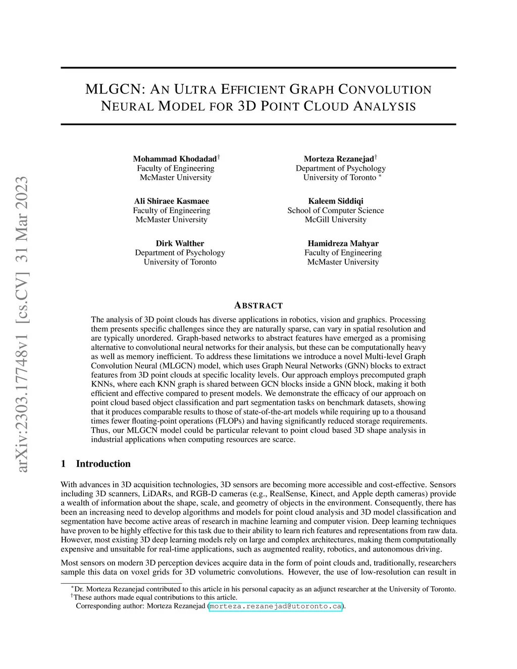 The analysis of 3D point clouds has diverse applications in robotics, vision and graphics. Processing them presents specific challenges since they are naturally sparse, can vary in spatial resolution and are typically unordered. Graph-based networks to abstract features have emerged as a promising alternative to convolutional neural networks for their analysis, but these can be computationally heavy as well as memory inefficient. To address these limitations we introduce a novel Multi-level Graph Convolution Neural (MLGCN) model, which uses Graph Neural Networks (GNN) blocks to extract features from 3D point clouds at specific locality levels. Our approach employs precomputed graph KNNs, where each KNN graph is shared between GCN blocks inside a GNN block, making it both efficient and effective compared to present models. We demonstrate the efficacy of our approach on point cloud based object classification and part segmentation tasks on benchmark datasets, showing that it produces comparable results to those of state-of-the-art models while requiring up to a thousand times fewer floating-point operations (FLOPs) and having significantly reduced storage requirements. Thus, our MLGCN model could be particular relevant to point cloud based 3D shape analysis in industrial applications when computing resources are scarce.