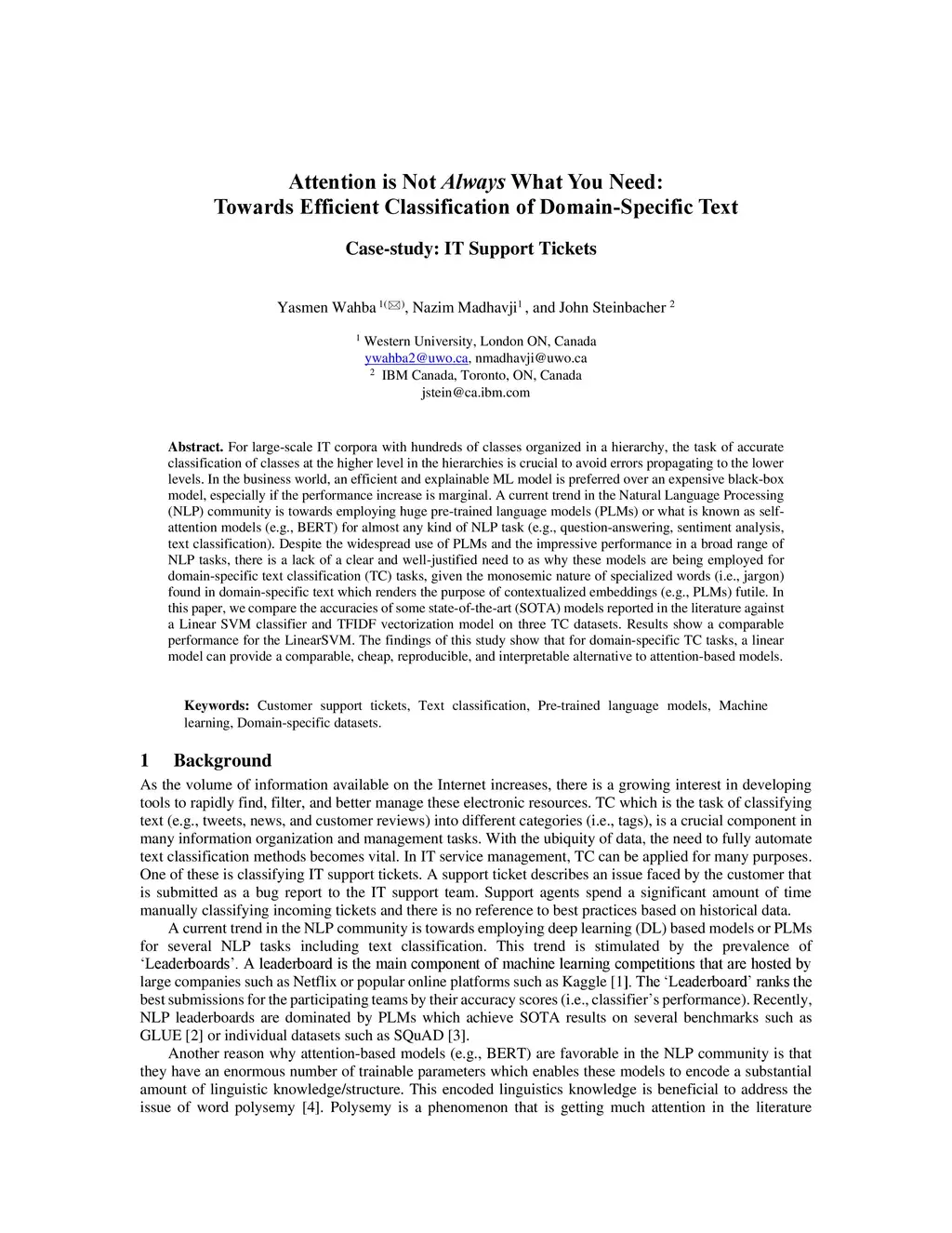 For large-scale IT corpora with hundreds of classes organized in a hierarchy, the task of accurate classification of classes at the higher level in the hierarchies is crucial to avoid errors propagating to the lower levels. In the business world, an efficient and explainable ML model is preferred over an expensive black-box model, especially if the performance increase is marginal. A current trend in the Natural Language Processing (NLP) community is towards employing huge pre-trained language models (PLMs) or what is known as self-attention models (e.g., BERT) for almost any kind of NLP task (e.g., question-answering, sentiment analysis, text classification). Despite the widespread use of PLMs and the impressive performance in a broad range of NLP tasks, there is a lack of a clear and well-justified need to as why these models are being employed for domain-specific text classification (TC) tasks, given the monosemic nature of specialized words (i.e., jargon) found in domain-specific text which renders the purpose of contextualized embeddings (e.g., PLMs) futile. In this paper, we compare the accuracies of some state-of-the-art (SOTA) models reported in the literature against a Linear SVM classifier and TFIDF vectorization model on three TC datasets. Results show a comparable performance for the LinearSVM. The findings of this study show that for domain-specific TC tasks, a linear model can provide a comparable, cheap, reproducible, and interpretable alternative to attention-based models.