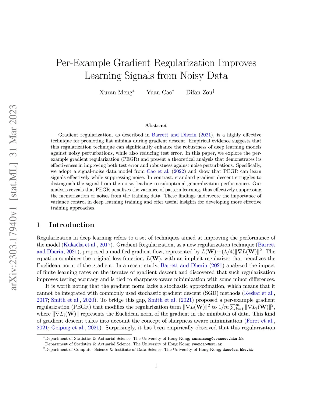 Gradient regularization, as described in \citet{barrett2021implicit}, is a highly effective technique for promoting flat minima during gradient descent. Empirical evidence suggests that this regularization technique can significantly enhance the robustness of deep learning models against noisy perturbations, while also reducing test error. In this paper, we explore the per-example gradient regularization (PEGR) and present a theoretical analysis that demonstrates its effectiveness in improving both test error and robustness against noise perturbations. Specifically, we adopt a signal-noise data model from \citet{cao2022benign} and show that PEGR can learn signals effectively while suppressing noise. In contrast, standard gradient descent struggles to distinguish the signal from the noise, leading to suboptimal generalization performance. Our analysis reveals that PEGR penalizes the variance of pattern learning, thus effectively suppressing the memorization of noises from the training data. These findings underscore the importance of variance control in deep learning training and offer useful insights for developing more effective training approaches.