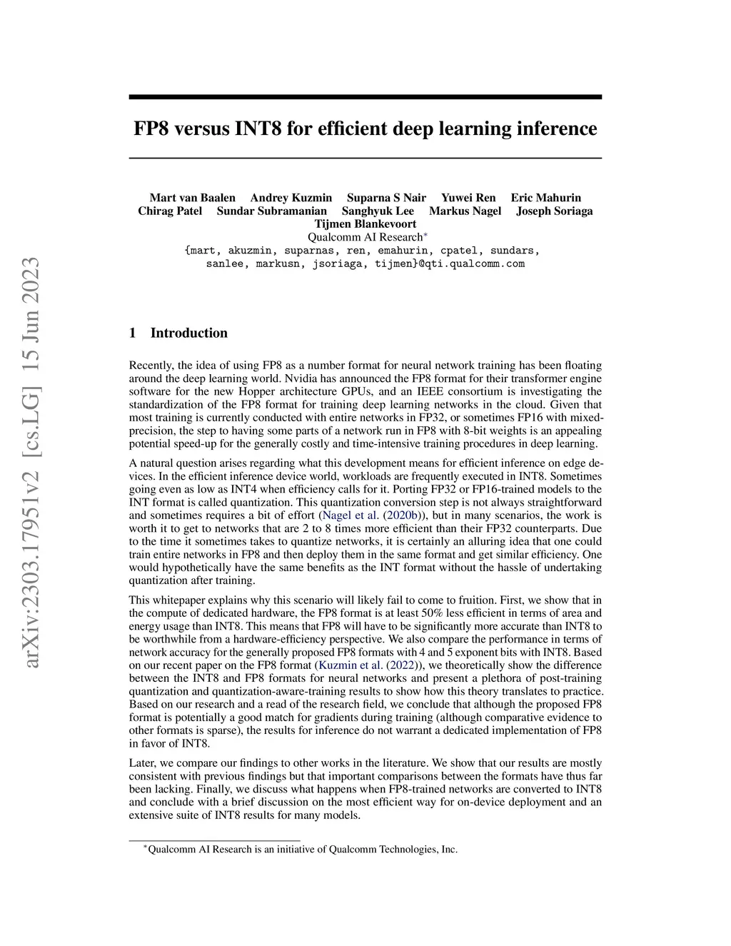 Recently, the idea of using FP8 as a number format for neural network training has been floating around the deep learning world. Given that most training is currently conducted with entire networks in FP32, or sometimes FP16 with mixed-precision, the step to having some parts of a network run in FP8 with 8-bit weights is an appealing potential speed-up for the generally costly and time-intensive training procedures in deep learning. A natural question arises regarding what this development means for efficient inference on edge devices. In the efficient inference device world, workloads are frequently executed in INT8. Sometimes going even as low as INT4 when efficiency calls for it. In this whitepaper, we compare the performance for both the FP8 and INT formats for efficient on-device inference. We theoretically show the difference between the INT and FP formats for neural networks and present a plethora of post-training quantization and quantization-aware-training results to show how this theory translates to practice. We also provide a hardware analysis showing that the FP formats are somewhere between 50-180% less efficient in terms of compute in dedicated hardware than the INT format. Based on our research and a read of the research field, we conclude that although the proposed FP8 format could be good for training, the results for inference do not warrant a dedicated implementation of FP8 in favor of INT8 for efficient inference. We show that our results are mostly consistent with previous findings but that important comparisons between the formats have thus far been lacking. Finally, we discuss what happens when FP8-trained networks are converted to INT8 and conclude with a brief discussion on the most efficient way for on-device deployment and an extensive suite of INT8 results for many models.