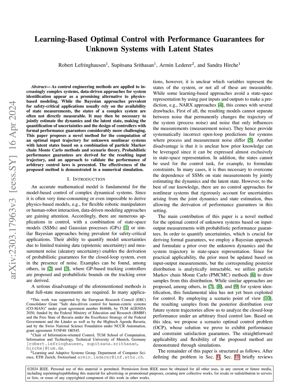 As control engineering methods are applied to increasingly complex systems, data-driven approaches for system identification appear as a promising alternative to physics-based modeling. While the Bayesian approaches prevalent for safety-critical applications usually rely on the availability of state measurements, the states of a complex system are often not directly measurable. It may then be necessary to jointly estimate the dynamics and the latent state, making the quantification of uncertainties and the design of controllers with formal performance guarantees considerably more challenging. This paper proposes a novel method for the computation of an optimal input trajectory for unknown nonlinear systems with latent states based on a combination of particle Markov chain Monte Carlo methods and scenario theory. Probabilistic performance guarantees are derived for the resulting input trajectory, and an approach to validate the performance of arbitrary control laws is presented. The effectiveness of the proposed method is demonstrated in a numerical simulation.