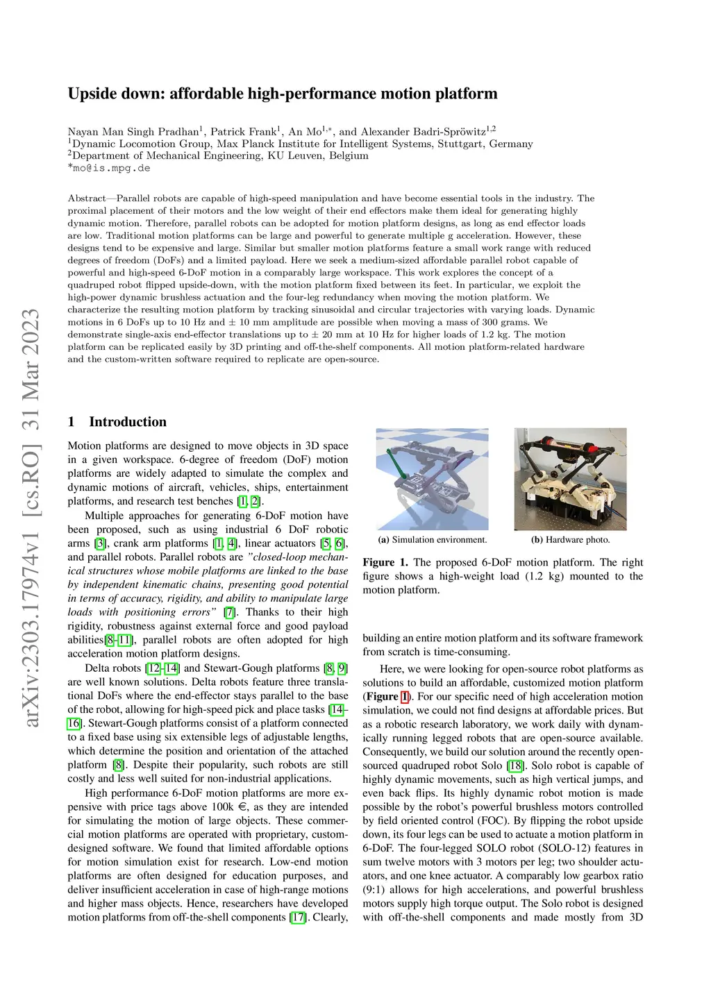 Parallel robots are capable of high-speed manipulation and have become essential tools in the industry. The proximal placement of their motors and the low weight of their end effectors make them ideal for generating highly dynamic motion. Therefore, parallel robots can be adopted for motion platform designs, as long as end effector loads are low. Traditional motion platforms can be large and powerful to generate multiple g acceleration. However, these designs tend to be expensive and large. Similar but smaller motion platforms feature a small work range with reduced degrees of freedom (DoFs) and a limited payload. Here we seek a medium-sized affordable parallel robot capable of powerful and high-speed 6-DoF motion in a comparably large workspace. This work explores the concept of a quadruped robot flipped upside-down, with the motion platform fixed between its feet. In particular, we exploit the high-power dynamic brushless actuation and the four-leg redundancy when moving the motion platform. We characterize the resulting motion platform by tracking sinusoidal and circular trajectories with varying loads. Dynamic motions in 6 DoFs up to 10 Hz and ~10 mm amplitude are possible when moving a mass of 300 grams. We demonstrate single-axis end-effector translations up to ~20 mm at 10 Hz for higher loads of 1.2 kg. The motion platform can be replicated easily by 3D printing and off-the-shelf components. All motion platform-related hardware and the custom-written software required to replicate are open-source.