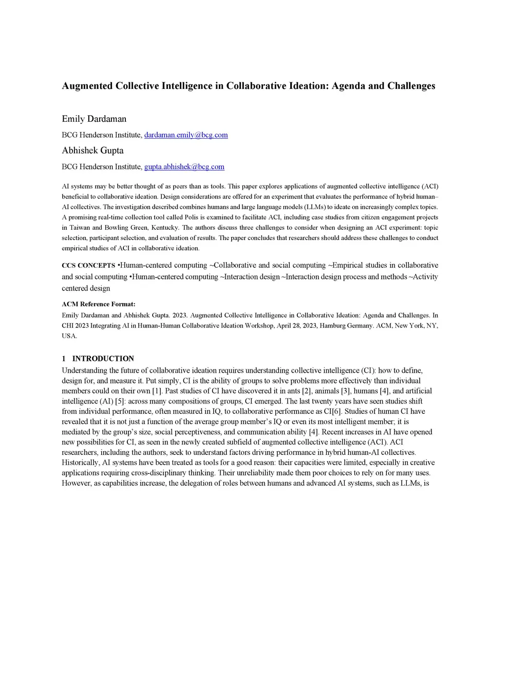 AI systems may be better thought of as peers than as tools. This paper explores applications of augmented collective intelligence (ACI) beneficial to collaborative ideation. Design considerations are offered for an experiment that evaluates the performance of hybrid human- AI collectives. The investigation described combines humans and large language models (LLMs) to ideate on increasingly complex topics. A promising real-time collection tool called Polis is examined to facilitate ACI, including case studies from citizen engagement projects in Taiwan and Bowling Green, Kentucky. The authors discuss three challenges to consider when designing an ACI experiment: topic selection, participant selection, and evaluation of results. The paper concludes that researchers should address these challenges to conduct empirical studies of ACI in collaborative ideation.