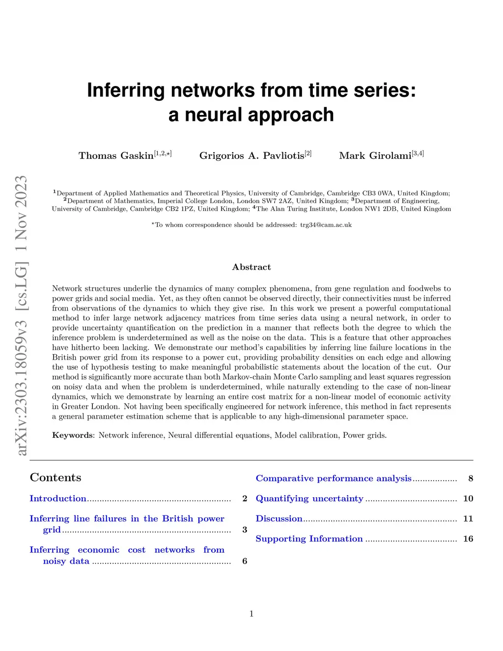 Network structures underlie the dynamics of many complex phenomena, from gene regulation and foodwebs to power grids and social media. Yet, as they often cannot be observed directly, their connectivities must be inferred from observations of the dynamics to which they give rise. In this work we present a powerful computational method to infer large network adjacency matrices from time series data using a neural network, in order to provide uncertainty quantification on the prediction in a manner that reflects both the degree to which the inference problem is underdetermined as well as the noise on the data. This is a feature that other approaches have hitherto been lacking. We demonstrate our method's capabilities by inferring line failure locations in the British power grid from its response to a power cut, providing probability densities on each edge and allowing the use of hypothesis testing to make meaningful probabilistic statements about the location of the cut. Our method is significantly more accurate than both Markov-chain Monte Carlo sampling and least squares regression on noisy data and when the problem is underdetermined, while naturally extending to the case of non-linear dynamics, which we demonstrate by learning an entire cost matrix for a non-linear model of economic activity in Greater London. Not having been specifically engineered for network inference, this method in fact represents a general parameter estimation scheme that is applicable to any high-dimensional parameter space.