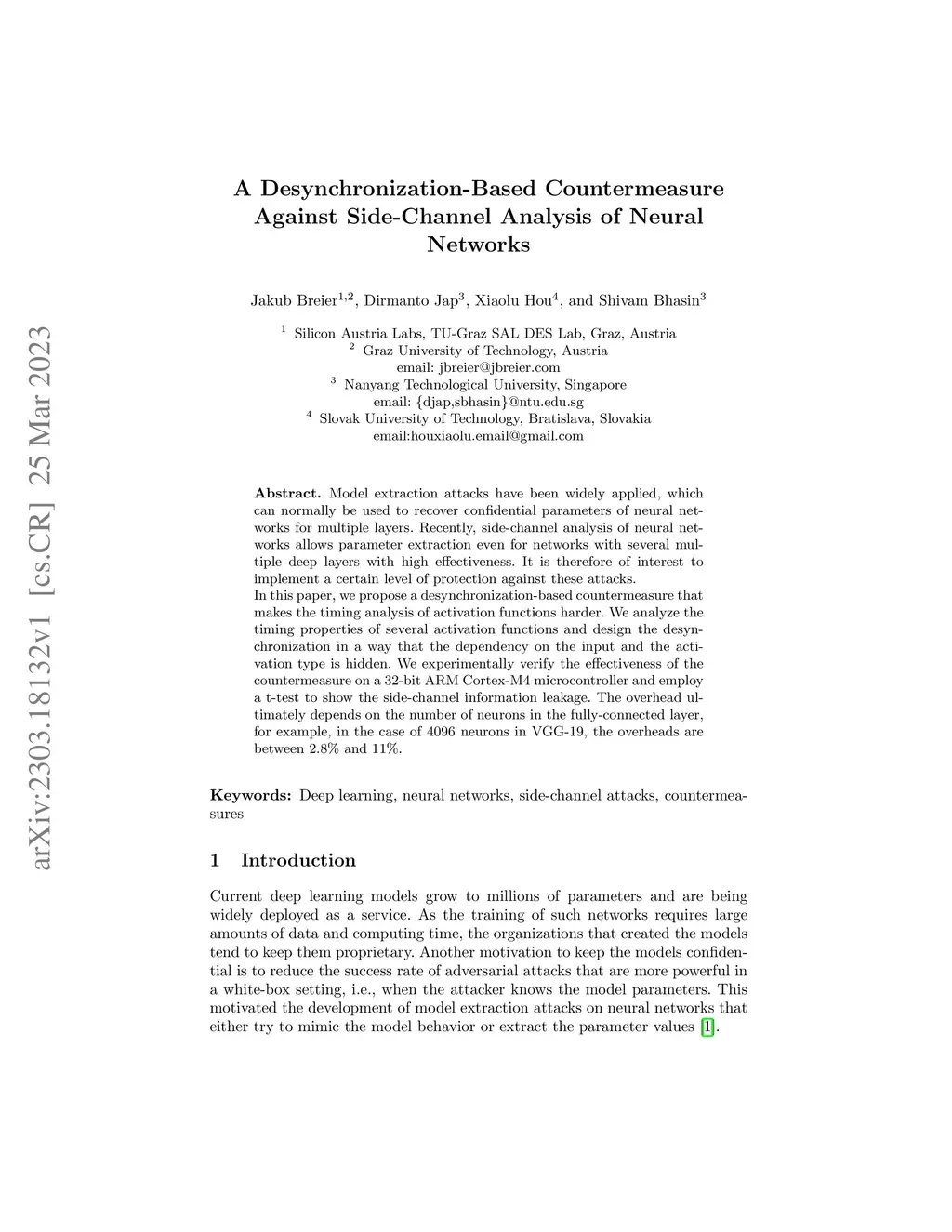 Model extraction attacks have been widely applied, which can normally be used to recover confidential parameters of neural networks for multiple layers. Recently, side-channel analysis of neural networks allows parameter extraction even for networks with several multiple deep layers with high effectiveness. It is therefore of interest to implement a certain level of protection against these attacks. In this paper, we propose a desynchronization-based countermeasure that makes the timing analysis of activation functions harder. We analyze the timing properties of several activation functions and design the desynchronization in a way that the dependency on the input and the activation type is hidden. We experimentally verify the effectiveness of the countermeasure on a 32-bit ARM Cortex-M4 microcontroller and employ a t-test to show the side-channel information leakage. The overhead ultimately depends on the number of neurons in the fully-connected layer, for example, in the case of 4096 neurons in VGG-19, the overheads are between 2.8% and 11%.