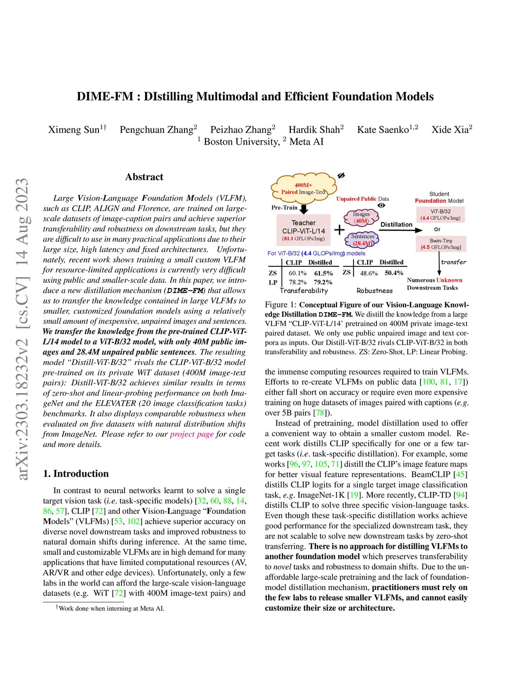 Large Vision-Language Foundation Models (VLFM), such as CLIP, ALIGN and Florence, are trained on large-scale datasets of image-caption pairs and achieve superior transferability and robustness on downstream tasks, but they are difficult to use in many practical applications due to their large size, high latency and fixed architectures. Unfortunately, recent work shows training a small custom VLFM for resource-limited applications is currently very difficult using public and smaller-scale data. In this paper, we introduce a new distillation mechanism (DIME-FM) that allows us to transfer the knowledge contained in large VLFMs to smaller, customized foundation models using a relatively small amount of inexpensive, unpaired images and sentences. We transfer the knowledge from the pre-trained CLIP-ViTL/14 model to a ViT-B/32 model, with only 40M public images and 28.4M unpaired public sentences. The resulting model "Distill-ViT-B/32" rivals the CLIP-ViT-B/32 model pre-trained on its private WiT dataset (400M image-text pairs): Distill-ViT-B/32 achieves similar results in terms of zero-shot and linear-probing performance on both ImageNet and the ELEVATER (20 image classification tasks) benchmarks. It also displays comparable robustness when evaluated on five datasets with natural distribution shifts from ImageNet.