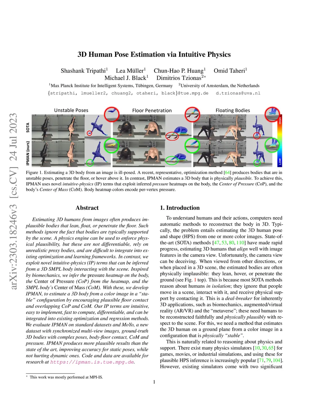 Estimating 3D humans from images often produces implausible bodies that lean, float, or penetrate the floor. Such methods ignore the fact that bodies are typically supported by the scene. A physics engine can be used to enforce physical plausibility, but these are not differentiable, rely on unrealistic proxy bodies, and are difficult to integrate into existing optimization and learning frameworks. In contrast, we exploit novel intuitive-physics (IP) terms that can be inferred from a 3D SMPL body interacting with the scene. Inspired by biomechanics, we infer the pressure heatmap on the body, the Center of Pressure (CoP) from the heatmap, and the SMPL body's Center of Mass (CoM). With these, we develop IPMAN, to estimate a 3D body from a color image in a "stable" configuration by encouraging plausible floor contact and overlapping CoP and CoM. Our IP terms are intuitive, easy to implement, fast to compute, differentiable, and can be integrated into existing optimization and regression methods. We evaluate IPMAN on standard datasets and MoYo, a new dataset with synchronized multi-view images, ground-truth 3D bodies with complex poses, body-floor contact, CoM and pressure. IPMAN produces more plausible results than the state of the art, improving accuracy for static poses, while not hurting dynamic ones. Code and data are available for research at https://ipman.is.tue.mpg.de.