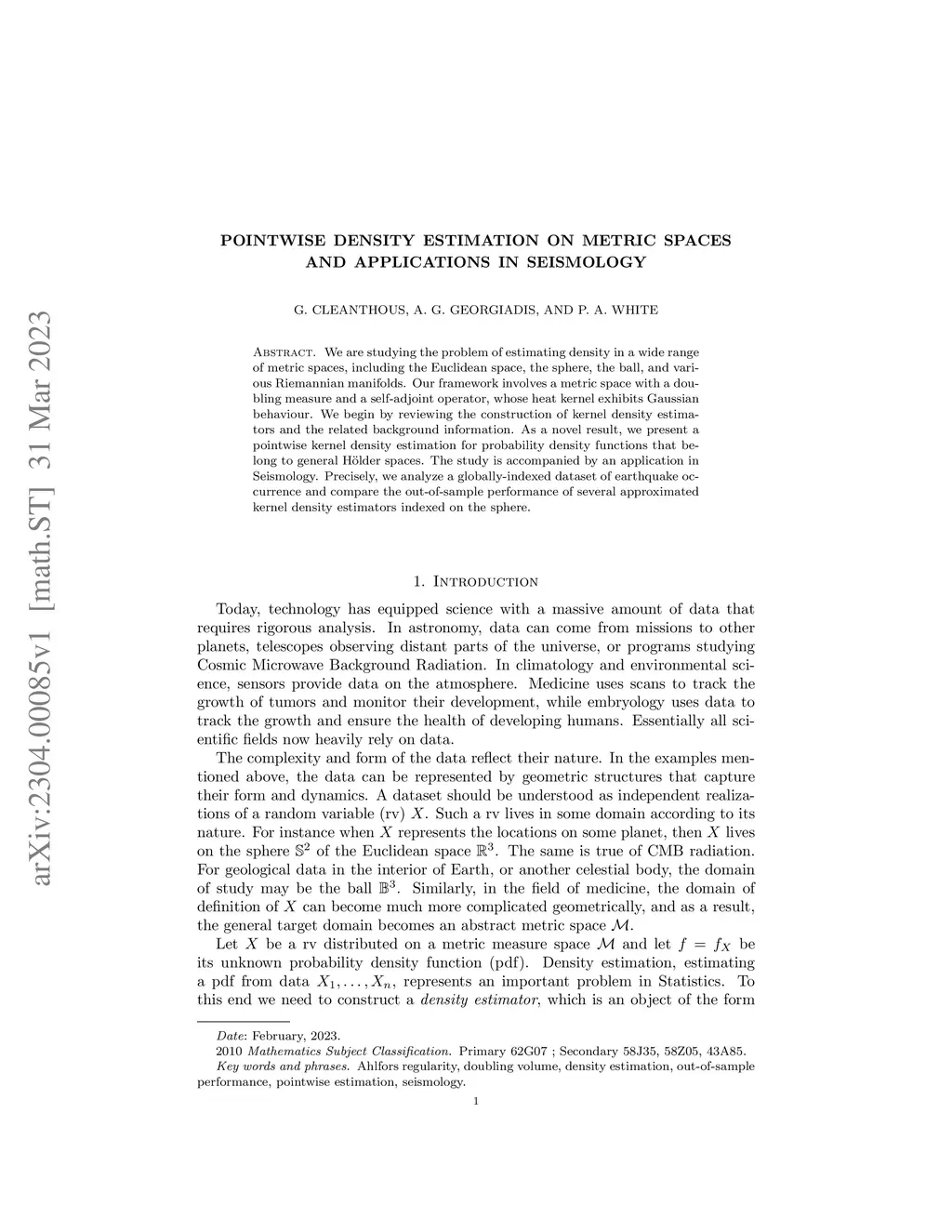 We are studying the problem of estimating density in a wide range of metric spaces, including the Euclidean space, the sphere, the ball, and various Riemannian manifolds. Our framework involves a metric space with a doubling measure and a self-adjoint operator, whose heat kernel exhibits Gaussian behaviour. We begin by reviewing the construction of kernel density estimators and the related background information. As a novel result, we present a pointwise kernel density estimation for probability density functions that belong to general H\"{o}lder spaces. The study is accompanied by an application in Seismology. Precisely, we analyze a globally-indexed dataset of earthquake occurrence and compare the out-of-sample performance of several approximated kernel density estimators indexed on the sphere.