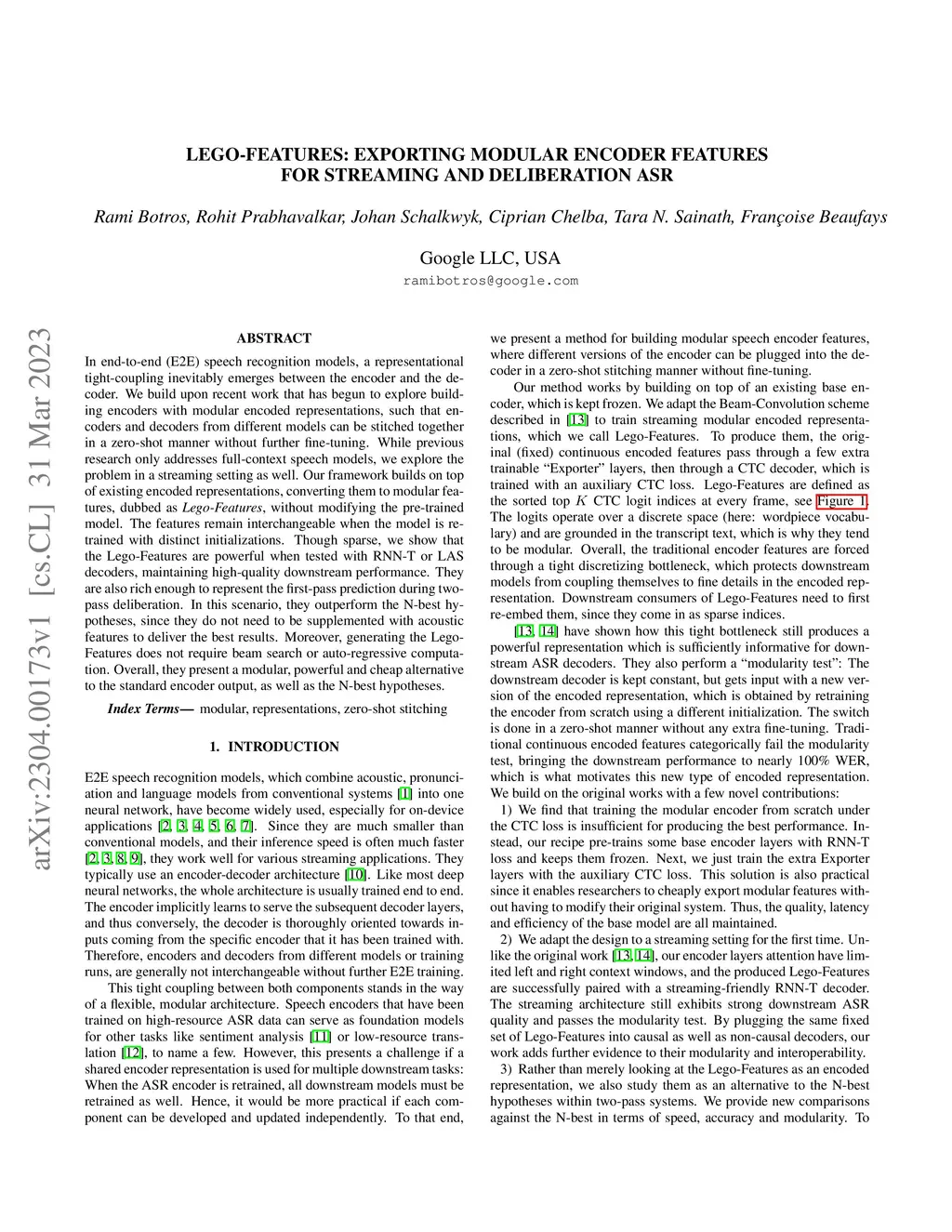 In end-to-end (E2E) speech recognition models, a representational tight-coupling inevitably emerges between the encoder and the decoder. We build upon recent work that has begun to explore building encoders with modular encoded representations, such that encoders and decoders from different models can be stitched together in a zero-shot manner without further fine-tuning. While previous research only addresses full-context speech models, we explore the problem in a streaming setting as well. Our framework builds on top of existing encoded representations, converting them to modular features, dubbed as Lego-Features, without modifying the pre-trained model. The features remain interchangeable when the model is retrained with distinct initializations. Though sparse, we show that the Lego-Features are powerful when tested with RNN-T or LAS decoders, maintaining high-quality downstream performance. They are also rich enough to represent the first-pass prediction during two-pass deliberation. In this scenario, they outperform the N-best hypotheses, since they do not need to be supplemented with acoustic features to deliver the best results. Moreover, generating the Lego-Features does not require beam search or auto-regressive computation. Overall, they present a modular, powerful and cheap alternative to the standard encoder output, as well as the N-best hypotheses.