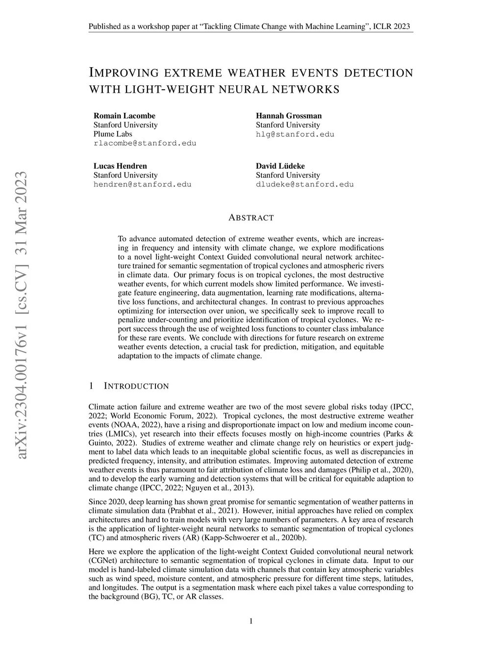 To advance automated detection of extreme weather events, which are increasing in frequency and intensity with climate change, we explore modifications to a novel light-weight Context Guided convolutional neural network architecture trained for semantic segmentation of tropical cyclones and atmospheric rivers in climate data. Our primary focus is on tropical cyclones, the most destructive weather events, for which current models show limited performance. We investigate feature engineering, data augmentation, learning rate modifications, alternative loss functions, and architectural changes. In contrast to previous approaches optimizing for intersection over union, we specifically seek to improve recall to penalize under-counting and prioritize identification of tropical cyclones. We report success through the use of weighted loss functions to counter class imbalance for these rare events. We conclude with directions for future research on extreme weather events detection, a crucial task for prediction, mitigation, and equitable adaptation to the impacts of climate change.