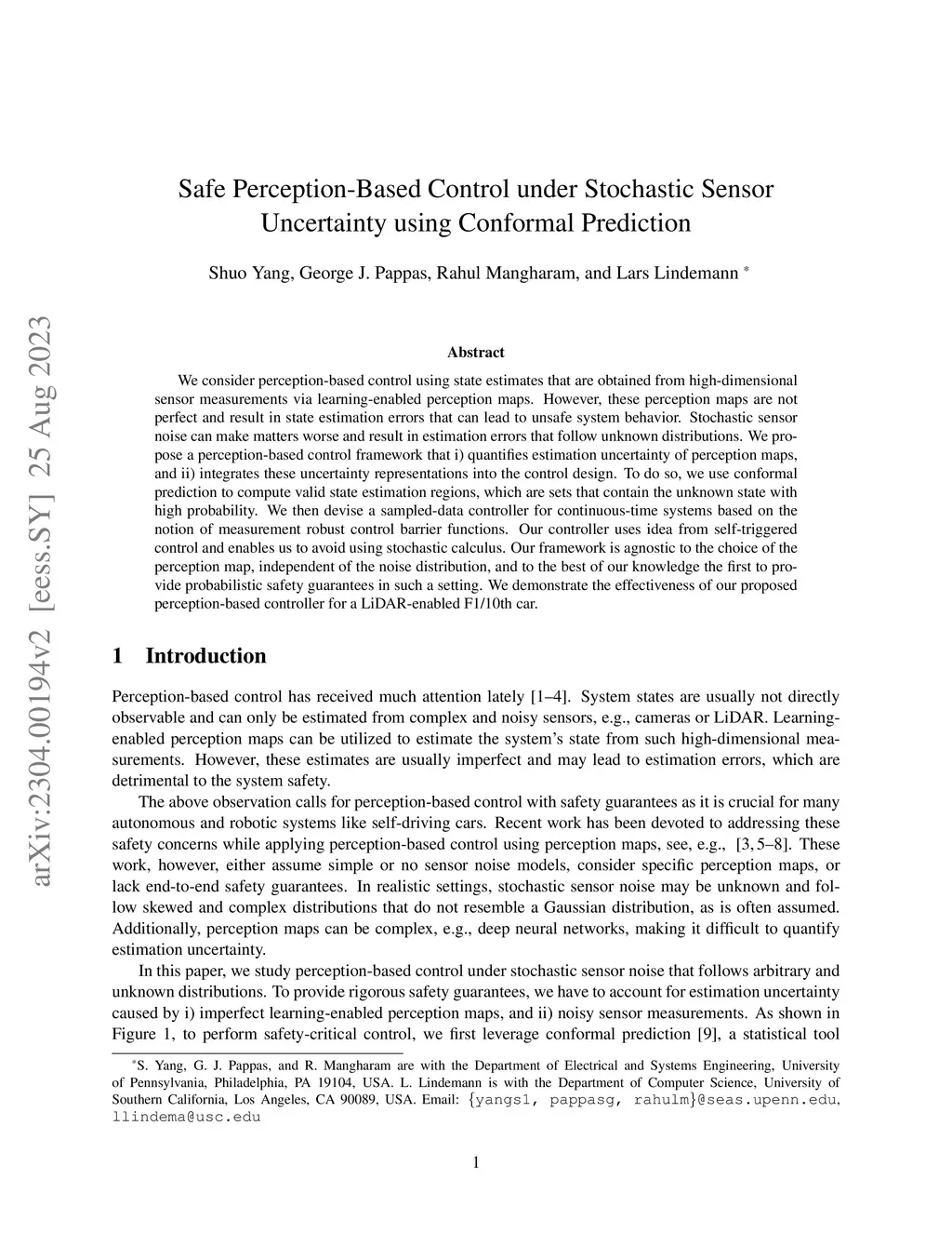We consider perception-based control using state estimates that are obtained from high-dimensional sensor measurements via learning-enabled perception maps. However, these perception maps are not perfect and result in state estimation errors that can lead to unsafe system behavior. Stochastic sensor noise can make matters worse and result in estimation errors that follow unknown distributions. We propose a perception-based control framework that i) quantifies estimation uncertainty of perception maps, and ii) integrates these uncertainty representations into the control design. To do so, we use conformal prediction to compute valid state estimation regions, which are sets that contain the unknown state with high probability. We then devise a sampled-data controller for continuous-time systems based on the notion of measurement robust control barrier functions. Our controller uses idea from self-triggered control and enables us to avoid using stochastic calculus. Our framework is agnostic to the choice of the perception map, independent of the noise distribution, and to the best of our knowledge the first to provide probabilistic safety guarantees in such a setting. We demonstrate the effectiveness of our proposed perception-based controller for a LiDAR-enabled F1/10th car.
