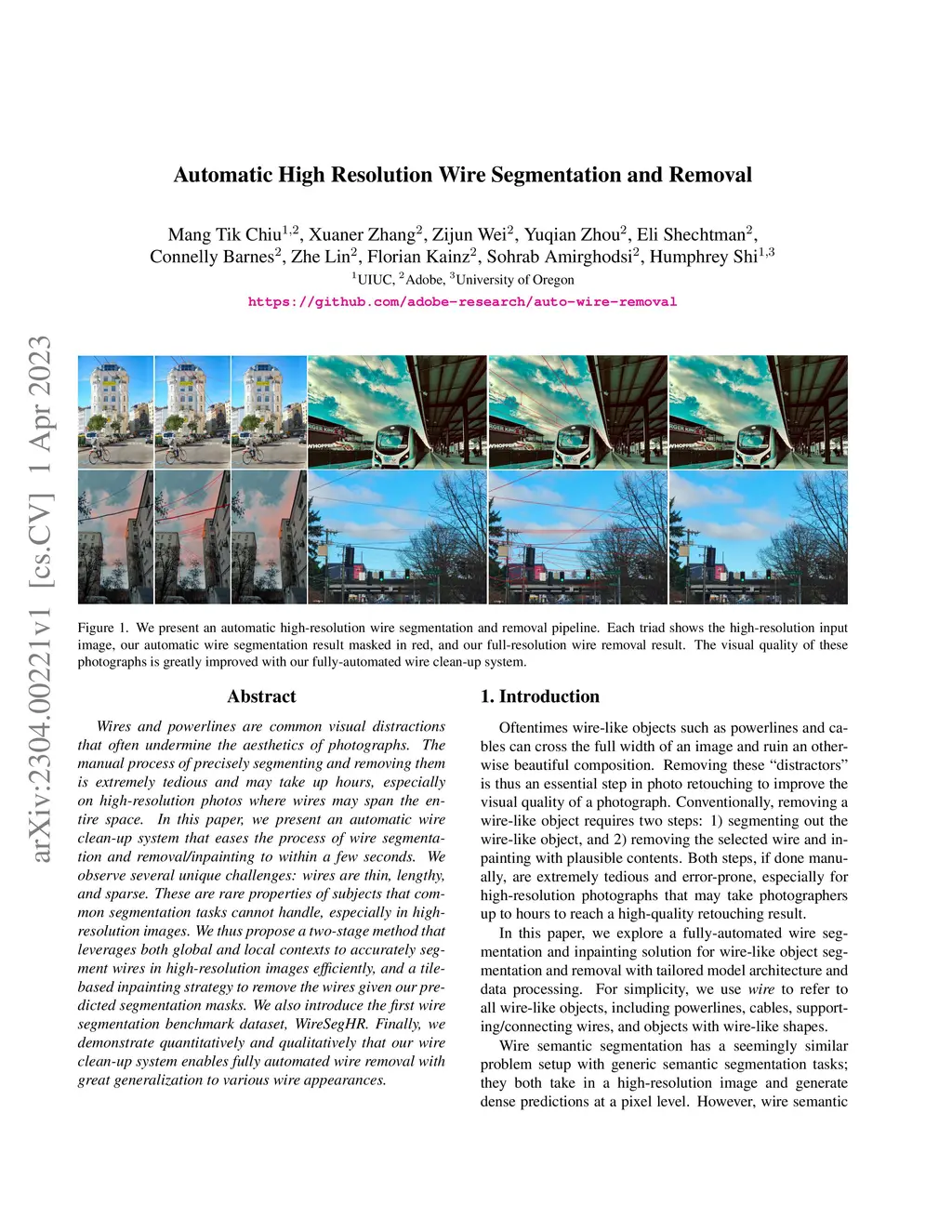 Wires and powerlines are common visual distractions that often undermine the aesthetics of photographs. The manual process of precisely segmenting and removing them is extremely tedious and may take up hours, especially on high-resolution photos where wires may span the entire space. In this paper, we present an automatic wire clean-up system that eases the process of wire segmentation and removal/inpainting to within a few seconds. We observe several unique challenges: wires are thin, lengthy, and sparse. These are rare properties of subjects that common segmentation tasks cannot handle, especially in high-resolution images. We thus propose a two-stage method that leverages both global and local contexts to accurately segment wires in high-resolution images efficiently, and a tile-based inpainting strategy to remove the wires given our predicted segmentation masks. We also introduce the first wire segmentation benchmark dataset, WireSegHR. Finally, we demonstrate quantitatively and qualitatively that our wire clean-up system enables fully automated wire removal with great generalization to various wire appearances.
