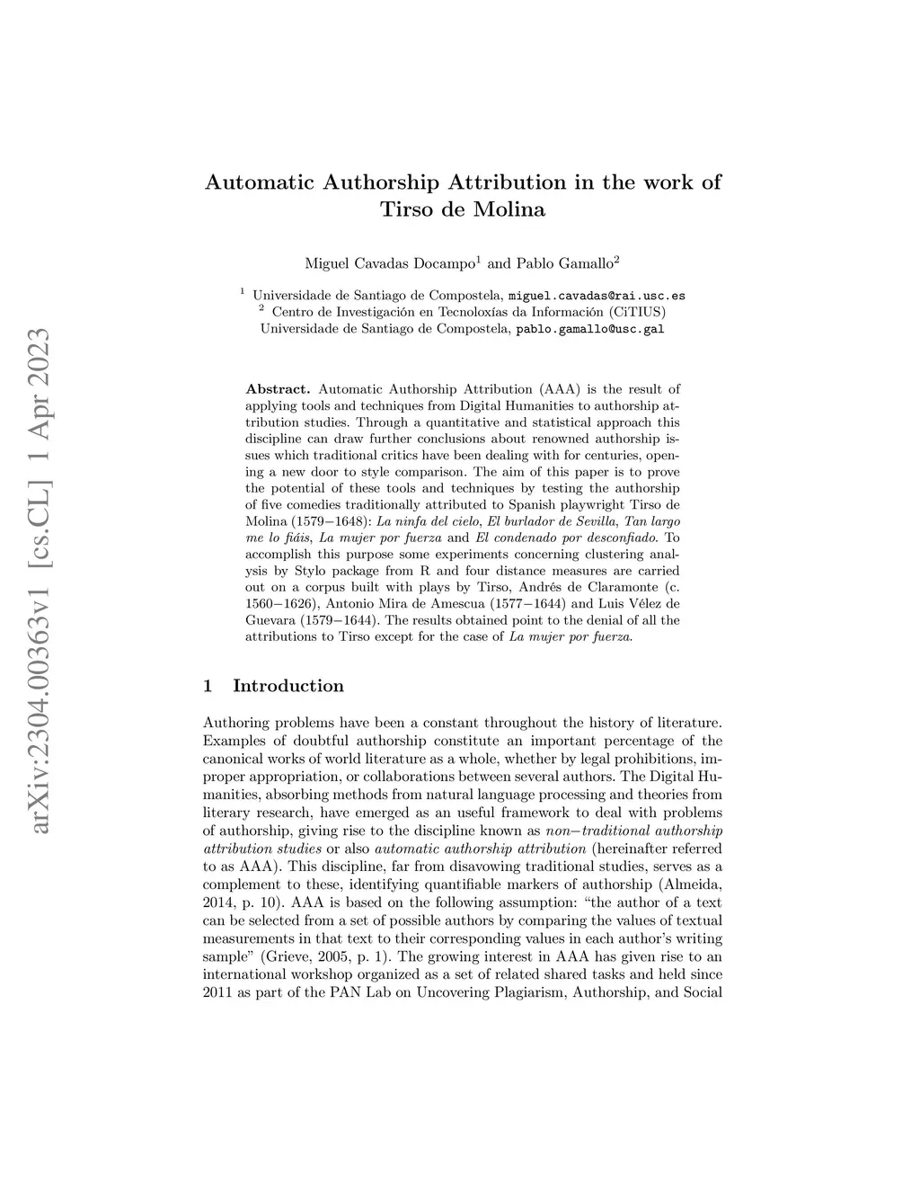 Automatic Authorship Attribution (AAA) is the result of applying tools and techniques from Digital Humanities to authorship attribution studies. Through a quantitative and statistical approach this discipline can draw further conclusions about renowned authorship issues which traditional critics have been dealing with for centuries, opening a new door to style comparison. The aim of this paper is to prove the potential of these tools and techniques by testing the authorship of five comedies traditionally attributed to Spanish playwright Tirso de Molina (1579-1648): La ninfa del cielo, El burlador de Sevilla, Tan largo me lo fiais, La mujer por fuerza and El condenado por desconfiado. To accomplish this purpose some experiments concerning clustering analysis by Stylo package from R and four distance measures are carried out on a corpus built with plays by Tirso, Andres de Claramonte (c. 1560-1626), Antonio Mira de Amescua (1577-1644) and Luis Velez de Guevara (1579-1644). The results obtained point to the denial of all the attributions to Tirso except for the case of La mujer por fuerza.