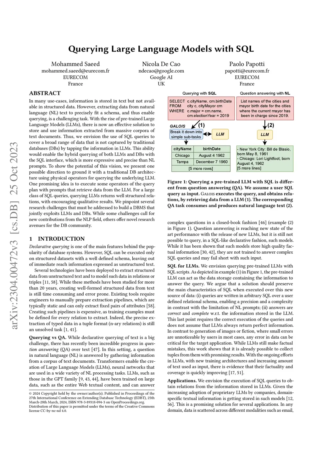 In many use-cases, information is stored in text but not available in structured data. However, extracting data from natural language text to precisely fit a schema, and thus enable querying, is a challenging task. With the rise of pre-trained Large Language Models (LLMs), there is now an effective solution to store and use information extracted from massive corpora of text documents. Thus, we envision the use of SQL queries to cover a broad range of data that is not captured by traditional databases by tapping the information in LLMs. To ground this vision, we present Galois, a prototype based on a traditional database architecture, but with new physical operators for querying the underlying LLM. The main idea is to execute some operators of the the query plan with prompts that retrieve data from the LLM. For a large class of SQL queries, querying LLMs returns well structured relations, with encouraging qualitative results. Preliminary experimental results make pre-trained LLMs a promising addition to the field of database systems, introducing a new direction for hybrid query processing. However, we pinpoint several research challenges that must be addressed to build a DBMS that exploits LLMs. While some of these challenges necessitate integrating concepts from the NLP literature, others offer novel research avenues for the DB community.