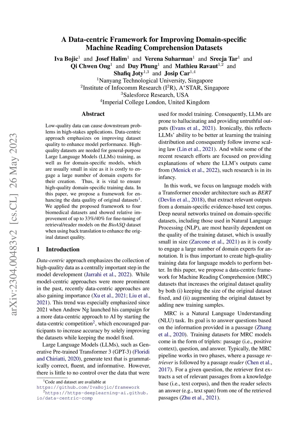 Low-quality data can cause downstream problems in high-stakes applications. Data-centric approach emphasizes on improving dataset quality to enhance model performance. High-quality datasets are needed for general-purpose Large Language Models (LLMs) training, as well as for domain-specific models, which are usually small in size as it is costly to engage a large number of domain experts for their creation. Thus, it is vital to ensure high-quality domain-specific training data. In this paper, we propose a framework for enhancing the data quality of original datasets. We applied the proposed framework to four biomedical datasets and showed relative improvement of up to 33%/40% for fine-tuning of retrieval/reader models on the BioASQ dataset when using back translation to enhance the original dataset quality.