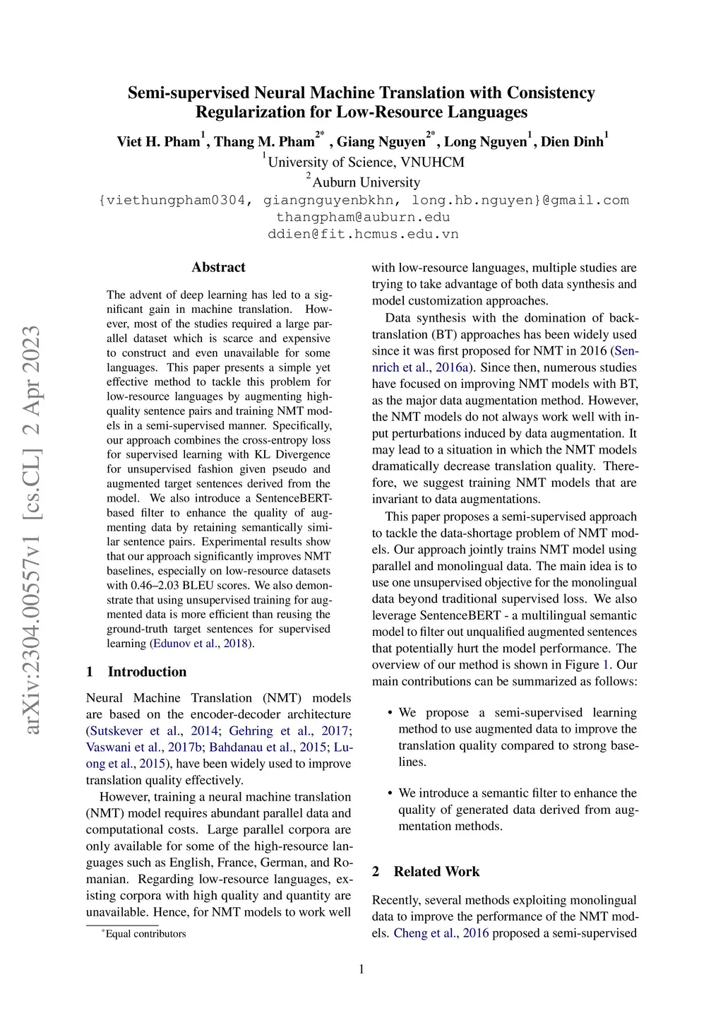 The advent of deep learning has led to a significant gain in machine translation. However, most of the studies required a large parallel dataset which is scarce and expensive to construct and even unavailable for some languages. This paper presents a simple yet effective method to tackle this problem for low-resource languages by augmenting high-quality sentence pairs and training NMT models in a semi-supervised manner. Specifically, our approach combines the cross-entropy loss for supervised learning with KL Divergence for unsupervised fashion given pseudo and augmented target sentences derived from the model. We also introduce a SentenceBERT-based filter to enhance the quality of augmenting data by retaining semantically similar sentence pairs. Experimental results show that our approach significantly improves NMT baselines, especially on low-resource datasets with 0.46--2.03 BLEU scores. We also demonstrate that using unsupervised training for augmented data is more efficient than reusing the ground-truth target sentences for supervised learning.