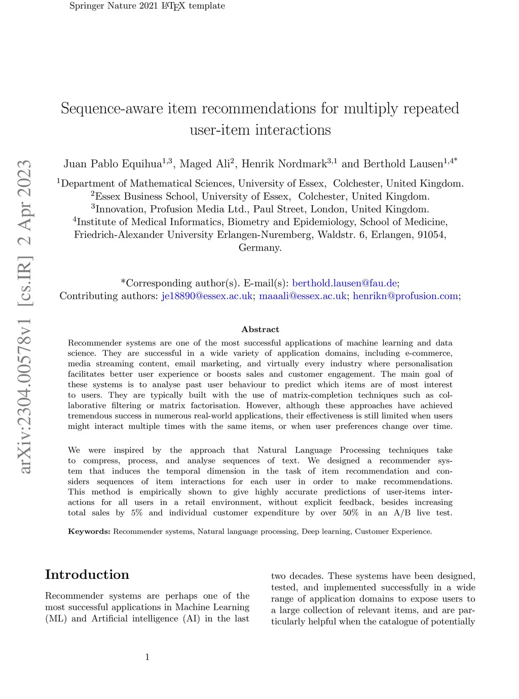 Recommender systems are one of the most successful applications of machine learning and data science. They are successful in a wide variety of application domains, including e-commerce, media streaming content, email marketing, and virtually every industry where personalisation facilitates better user experience or boosts sales and customer engagement. The main goal of these systems is to analyse past user behaviour to predict which items are of most interest to users. They are typically built with the use of matrix-completion techniques such as collaborative filtering or matrix factorisation. However, although these approaches have achieved tremendous success in numerous real-world applications, their effectiveness is still limited when users might interact multiple times with the same items, or when user preferences change over time. We were inspired by the approach that Natural Language Processing techniques take to compress, process, and analyse sequences of text. We designed a recommender system that induces the temporal dimension in the task of item recommendation and considers sequences of item interactions for each user in order to make recommendations. This method is empirically shown to give highly accurate predictions of user-items interactions for all users in a retail environment, without explicit feedback, besides increasing total sales by 5% and individual customer expenditure by over 50% in an A/B live test.