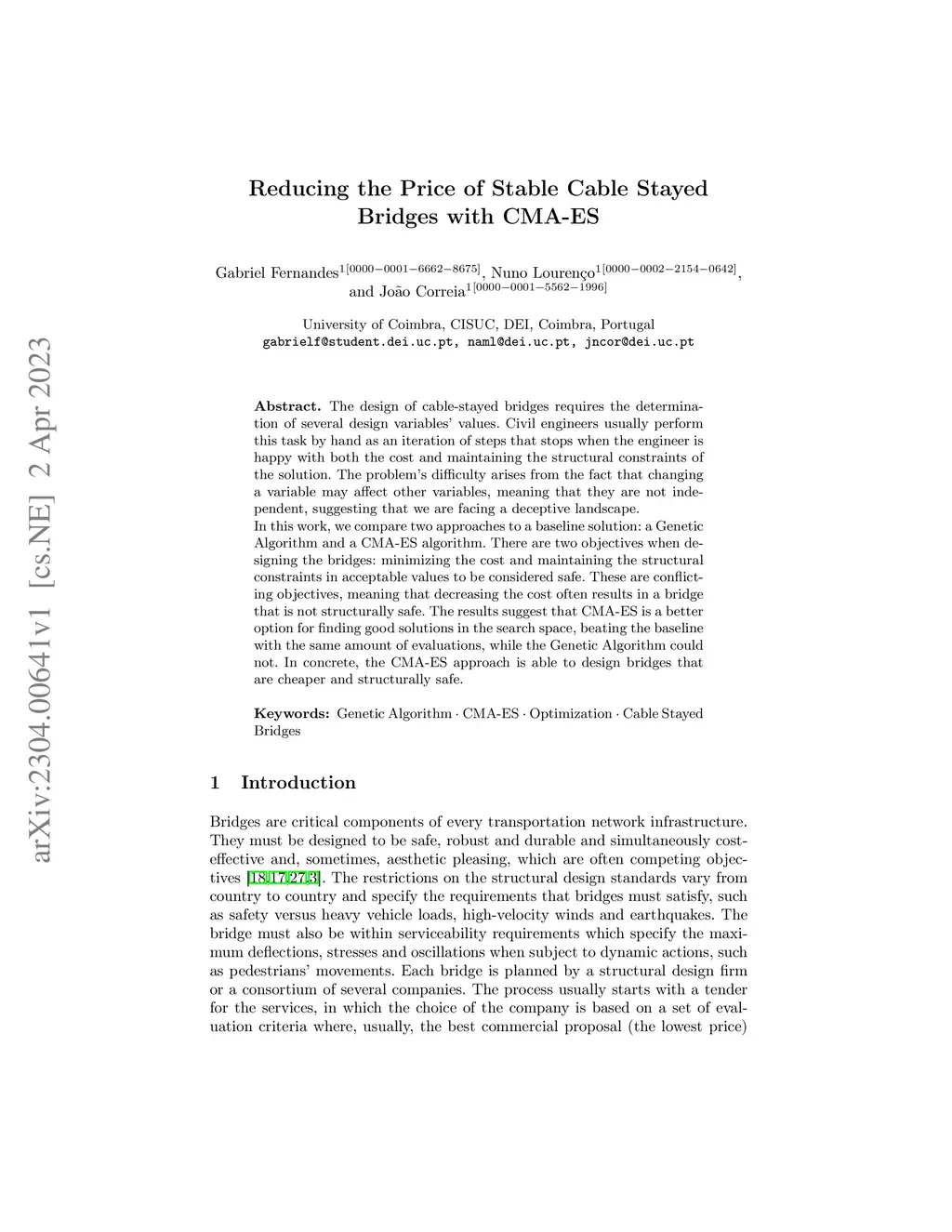 The design of cable-stayed bridges requires the determination of several design variables' values. Civil engineers usually perform this task by hand as an iteration of steps that stops when the engineer is happy with both the cost and maintaining the structural constraints of the solution. The problem's difficulty arises from the fact that changing a variable may affect other variables, meaning that they are not independent, suggesting that we are facing a deceptive landscape. In this work, we compare two approaches to a baseline solution: a Genetic Algorithm and a CMA-ES algorithm. There are two objectives when designing the bridges: minimizing the cost and maintaining the structural constraints in acceptable values to be considered safe. These are conflicting objectives, meaning that decreasing the cost often results in a bridge that is not structurally safe. The results suggest that CMA-ES is a better option for finding good solutions in the search space, beating the baseline with the same amount of evaluations, while the Genetic Algorithm could not. In concrete, the CMA-ES approach is able to design bridges that are cheaper and structurally safe.