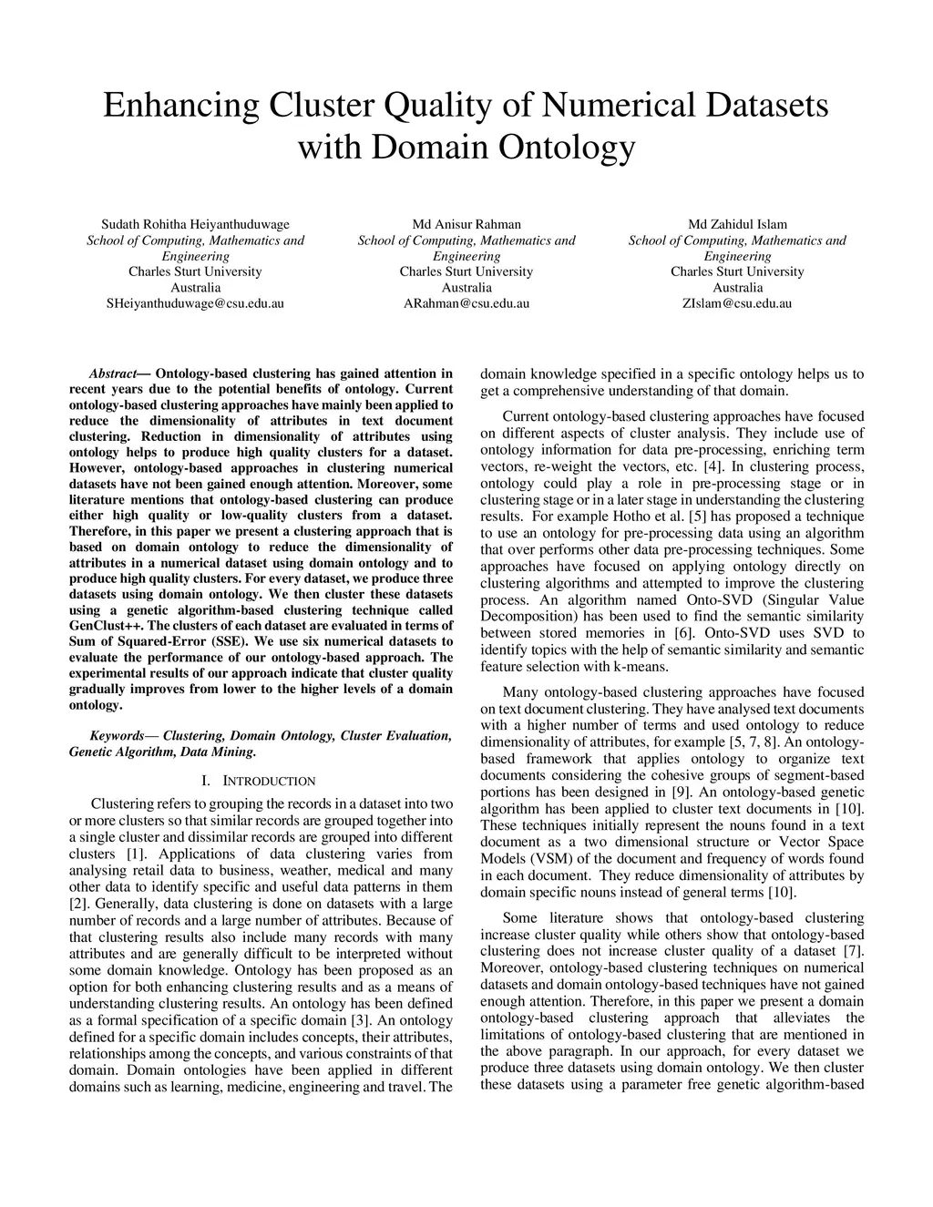 Ontology-based clustering has gained attention in recent years due to the potential benefits of ontology. Current ontology-based clustering approaches have mainly been applied to reduce the dimensionality of attributes in text document clustering. Reduction in dimensionality of attributes using ontology helps to produce high quality clusters for a dataset. However, ontology-based approaches in clustering numerical datasets have not been gained enough attention. Moreover, some literature mentions that ontology-based clustering can produce either high quality or low-quality clusters from a dataset. Therefore, in this paper we present a clustering approach that is based on domain ontology to reduce the dimensionality of attributes in a numerical dataset using domain ontology and to produce high quality clusters. For every dataset, we produce three datasets using domain ontology. We then cluster these datasets using a genetic algorithm-based clustering technique called GenClust++. The clusters of each dataset are evaluated in terms of Sum of Squared-Error (SSE). We use six numerical datasets to evaluate the performance of our ontology-based approach. The experimental results of our approach indicate that cluster quality gradually improves from lower to the higher levels of a domain ontology.