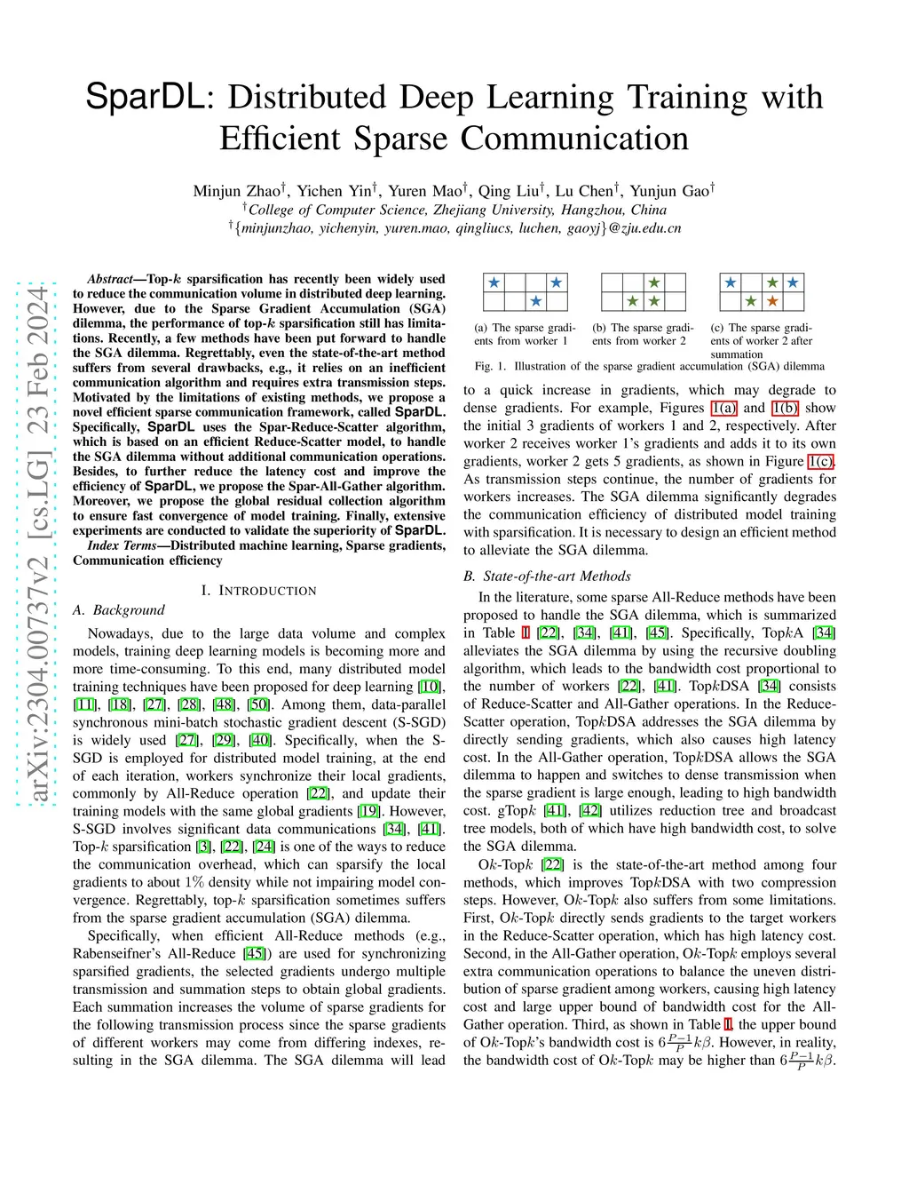 Top-k sparsification has recently been widely used to reduce the communication volume in distributed deep learning. However, due to the Sparse Gradient Accumulation (SGA) dilemma, the performance of top-k sparsification still has limitations. Recently, a few methods have been put forward to handle the SGA dilemma. Regrettably, even the state-of-the-art method suffers from several drawbacks, e.g., it relies on an inefficient communication algorithm and requires extra transmission steps. Motivated by the limitations of existing methods, we propose a novel efficient sparse communication framework, called SparDL. Specifically, SparDL uses the Spar-Reduce-Scatter algorithm, which is based on an efficient Reduce-Scatter model, to handle the SGA dilemma without additional communication operations. Besides, to further reduce the latency cost and improve the efficiency of SparDL, we propose the Spar-All-Gather algorithm. Moreover, we propose the global residual collection algorithm to ensure fast convergence of model training. Finally, extensive experiments are conducted to validate the superiority of SparDL.