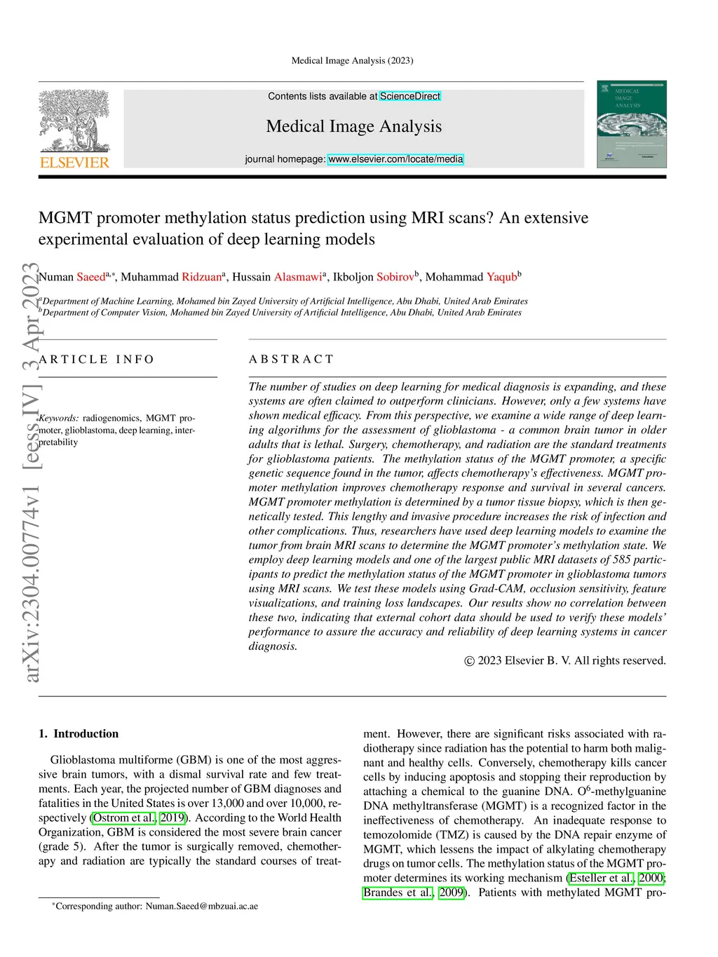 The number of studies on deep learning for medical diagnosis is expanding, and these systems are often claimed to outperform clinicians. However, only a few systems have shown medical efficacy. From this perspective, we examine a wide range of deep learning algorithms for the assessment of glioblastoma - a common brain tumor in older adults that is lethal. Surgery, chemotherapy, and radiation are the standard treatments for glioblastoma patients. The methylation status of the MGMT promoter, a specific genetic sequence found in the tumor, affects chemotherapy's effectiveness. MGMT promoter methylation improves chemotherapy response and survival in several cancers. MGMT promoter methylation is determined by a tumor tissue biopsy, which is then genetically tested. This lengthy and invasive procedure increases the risk of infection and other complications. Thus, researchers have used deep learning models to examine the tumor from brain MRI scans to determine the MGMT promoter's methylation state. We employ deep learning models and one of the largest public MRI datasets of 585 participants to predict the methylation status of the MGMT promoter in glioblastoma tumors using MRI scans. We test these models using Grad-CAM, occlusion sensitivity, feature visualizations, and training loss landscapes. Our results show no correlation between these two, indicating that external cohort data should be used to verify these models' performance to assure the accuracy and reliability of deep learning systems in cancer diagnosis.
