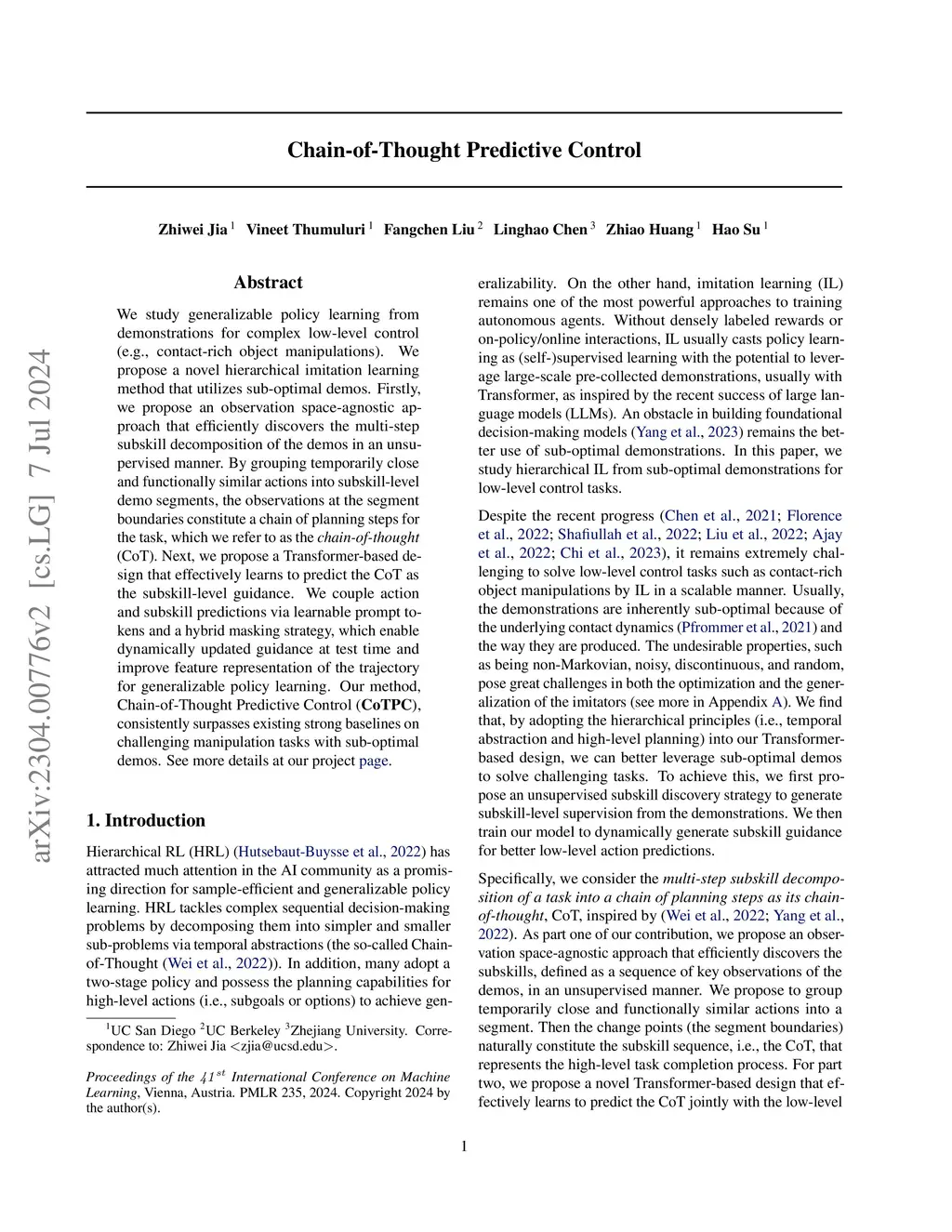 We study generalizable policy learning from demonstrations for complex low-level control (e.g., contact-rich object manipulations). We propose a novel hierarchical imitation learning method that utilizes sub-optimal demos. Firstly, we propose an observation space-agnostic approach that efficiently discovers the multi-step subskill decomposition of the demos in an unsupervised manner. By grouping temporarily close and functionally similar actions into subskill-level demo segments, the observations at the segment boundaries constitute a chain of planning steps for the task, which we refer to as the chain-of-thought (CoT). Next, we propose a Transformer-based design that effectively learns to predict the CoT as the subskill-level guidance. We couple action and subskill predictions via learnable prompt tokens and a hybrid masking strategy, which enable dynamically updated guidance at test time and improve feature representation of the trajectory for generalizable policy learning. Our method, Chain-of-Thought Predictive Control (CoTPC), consistently surpasses existing strong baselines on challenging manipulation tasks with sub-optimal demos.