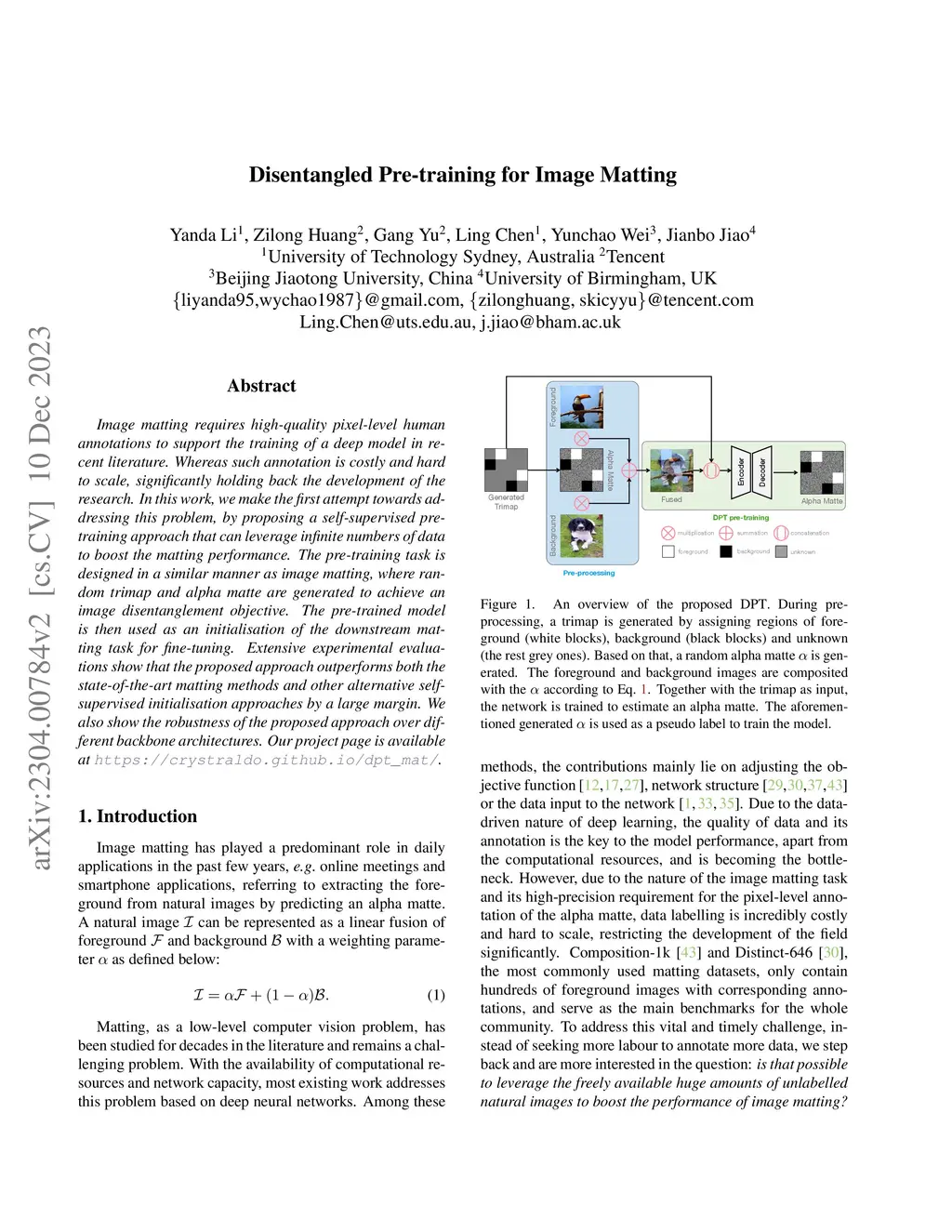 Image matting requires high-quality pixel-level human annotations to support the training of a deep model in recent literature. Whereas such annotation is costly and hard to scale, significantly holding back the development of the research. In this work, we make the first attempt towards addressing this problem, by proposing a self-supervised pre-training approach that can leverage infinite numbers of data to boost the matting performance. The pre-training task is designed in a similar manner as image matting, where random trimap and alpha matte are generated to achieve an image disentanglement objective. The pre-trained model is then used as an initialisation of the downstream matting task for fine-tuning. Extensive experimental evaluations show that the proposed approach outperforms both the state-of-the-art matting methods and other alternative self-supervised initialisation approaches by a large margin. We also show the robustness of the proposed approach over different backbone architectures. Our project page is available at https://crystraldo.github.io/dpt_mat/.