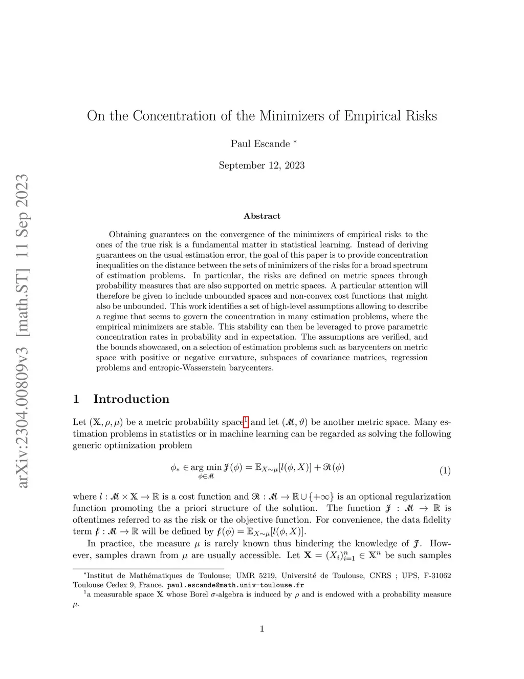 Obtaining guarantees on the convergence of the minimizers of empirical risks to the ones of the true risk is a fundamental matter in statistical learning. Instead of deriving guarantees on the usual estimation error, the goal of this paper is to provide concentration inequalities on the distance between the sets of minimizers of the risks for a broad spectrum of estimation problems. In particular, the risks are defined on metric spaces through probability measures that are also supported on metric spaces. A particular attention will therefore be given to include unbounded spaces and non-convex cost functions that might also be unbounded. This work identifies a set of assumptions allowing to describe a regime that seem to govern the concentration in many estimation problems, where the empirical minimizers are stable. This stability can then be leveraged to prove parametric concentration rates in probability and in expectation. The assumptions are verified, and the bounds showcased, on a selection of estimation problems such as barycenters on metric space with positive or negative curvature, subspaces of covariance matrices, regression problems and entropic-Wasserstein barycenters.