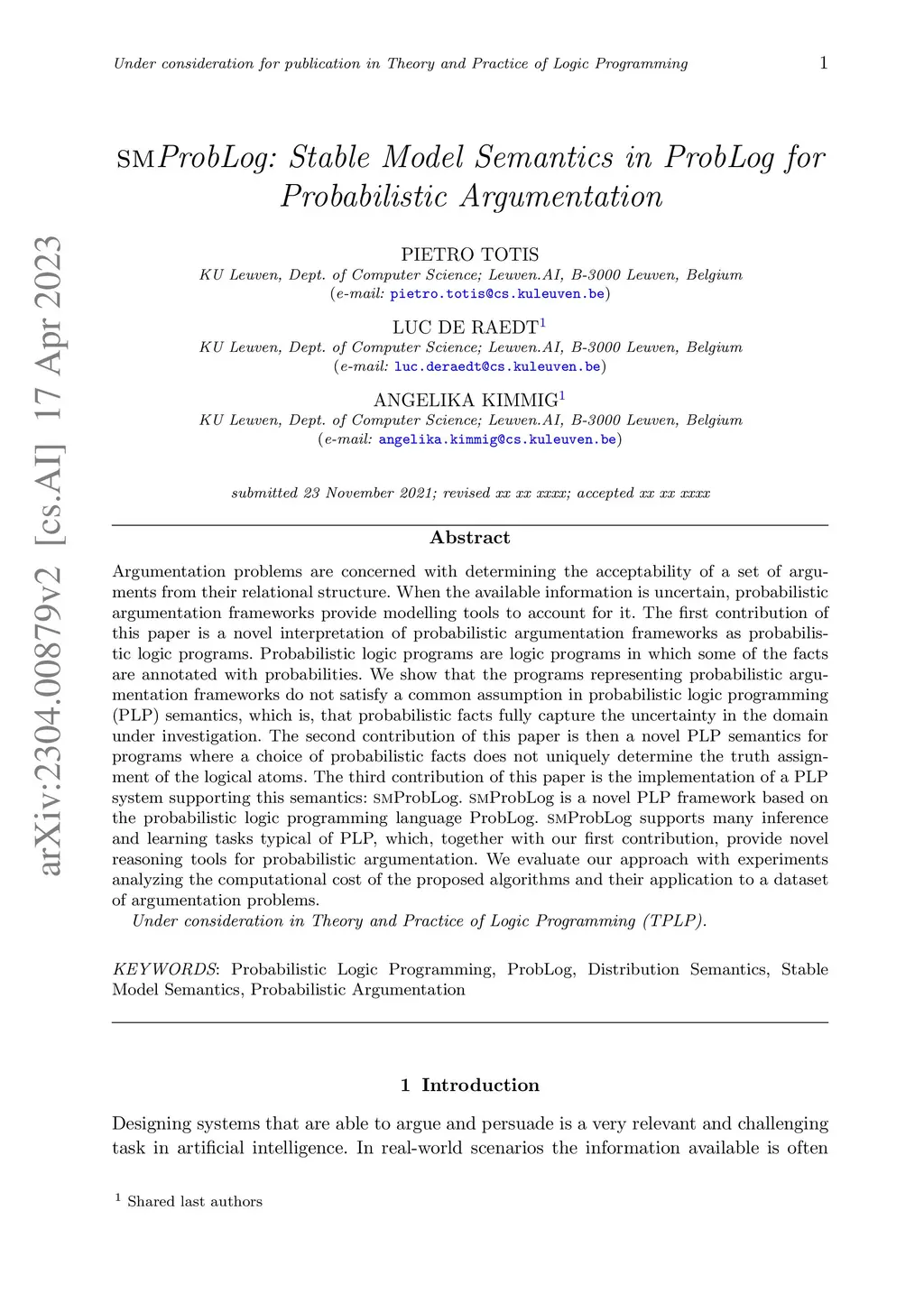 Argumentation problems are concerned with determining the acceptability of a set of arguments from their relational structure. When the available information is uncertain, probabilistic argumentation frameworks provide modelling tools to account for it. The first contribution of this paper is a novel interpretation of probabilistic argumentation frameworks as probabilistic logic programs. Probabilistic logic programs are logic programs in which some of the facts are annotated with probabilities. We show that the programs representing probabilistic argumentation frameworks do not satisfy a common assumption in probabilistic logic programming (PLP) semantics, which is, that probabilistic facts fully capture the uncertainty in the domain under investigation. The second contribution of this paper is then a novel PLP semantics for programs where a choice of probabilistic facts does not uniquely determine the truth assignment of the logical atoms. The third contribution of this paper is the implementation of a PLP system supporting this semantics: smProbLog. smProbLog is a novel PLP framework based on the probabilistic logic programming language ProbLog. smProbLog supports many inference and learning tasks typical of PLP, which, together with our first contribution, provide novel reasoning tools for probabilistic argumentation. We evaluate our approach with experiments analyzing the computational cost of the proposed algorithms and their application to a dataset of argumentation problems.