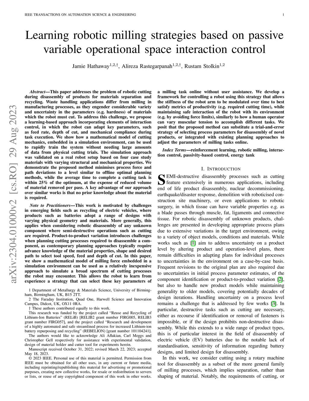 This paper addresses the problem of robotic cutting during disassembly of products for materials separation and recycling. Waste handling applications differ from milling in manufacturing processes, as they engender considerable variety and uncertainty in the parameters (e.g. hardness) of materials which the robot must cut. To address this challenge, we propose a learning-based approach incorporating elements of interaction control, in which the robot can adapt key parameters, such as feed rate, depth of cut, and mechanical compliance during task execution. We show how a mathematical model of cutting mechanics, embedded in a simulation environment, can be used to rapidly train the system without needing large amounts of data from physical cutting trials. The simulation approach was validated on a real robot setup based on four case study materials with varying structural and mechanical properties. We demonstrate the proposed method minimises process force and path deviations to a level similar to offline optimal planning methods, while the average time to complete a cutting task is within 25% of the optimum, at the expense of reduced volume of material removed per pass. A key advantage of our approach over similar works is that no prior knowledge about the material is required.