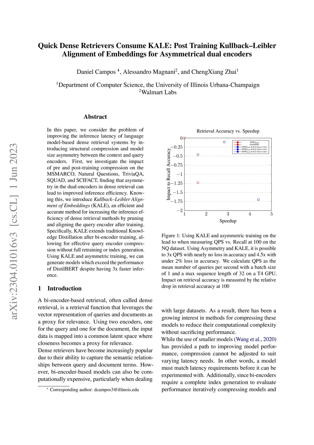 In this paper, we consider the problem of improving the inference latency of language model-based dense retrieval systems by introducing structural compression and model size asymmetry between the context and query encoders. First, we investigate the impact of pre and post-training compression on the MSMARCO, Natural Questions, TriviaQA, SQUAD, and SCIFACT, finding that asymmetry in the dual encoders in dense retrieval can lead to improved inference efficiency. Knowing this, we introduce Kullback Leibler Alignment of Embeddings (KALE), an efficient and accurate method for increasing the inference efficiency of dense retrieval methods by pruning and aligning the query encoder after training. Specifically, KALE extends traditional Knowledge Distillation after bi-encoder training, allowing for effective query encoder compression without full retraining or index generation. Using KALE and asymmetric training, we can generate models which exceed the performance of DistilBERT despite having 3x faster inference.