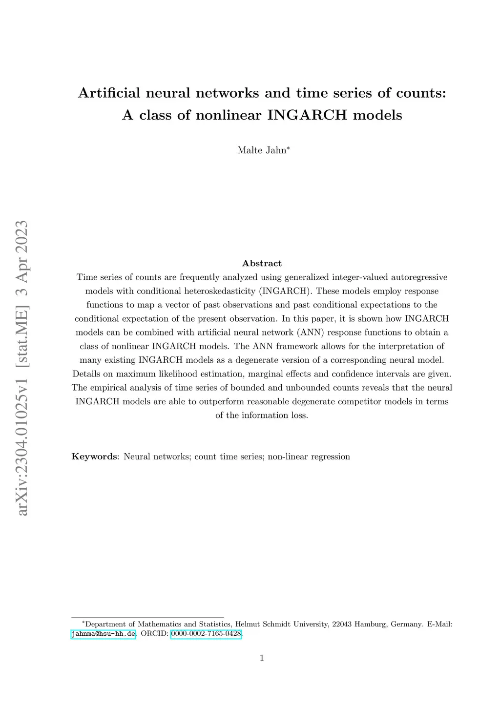Artificial neural networks and time series of counts: A class of