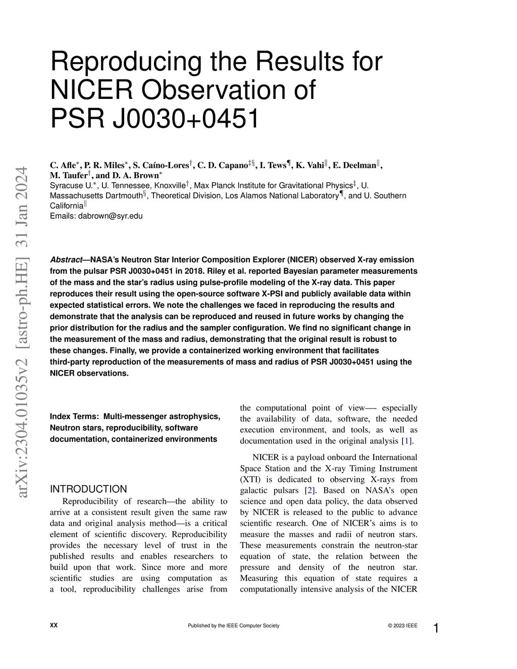NASA's Neutron Star Interior Composition Explorer (NICER) observed X-ray emission from the pulsar PSR J0030+0451 in 2018. Riley et al. reported Bayesian parameter measurements of the mass and the star's radius using pulse-profile modeling of the X-ray data. This paper reproduces their result using the open-source software X-PSI and publicly available data within expected statistical errors. We note the challenges we faced in reproducing the results and demonstrate that the analysis can be reproduced and reused in future works by changing the prior distribution for the radius and the sampler configuration. We find no significant change in the measurement of the mass and radius, demonstrating that the original result is robust to these changes. Finally, we provide a containerized working environment that facilitates third-party reproduction of the measurements of mass and radius of PSR J0030+0451 using the NICER observations.