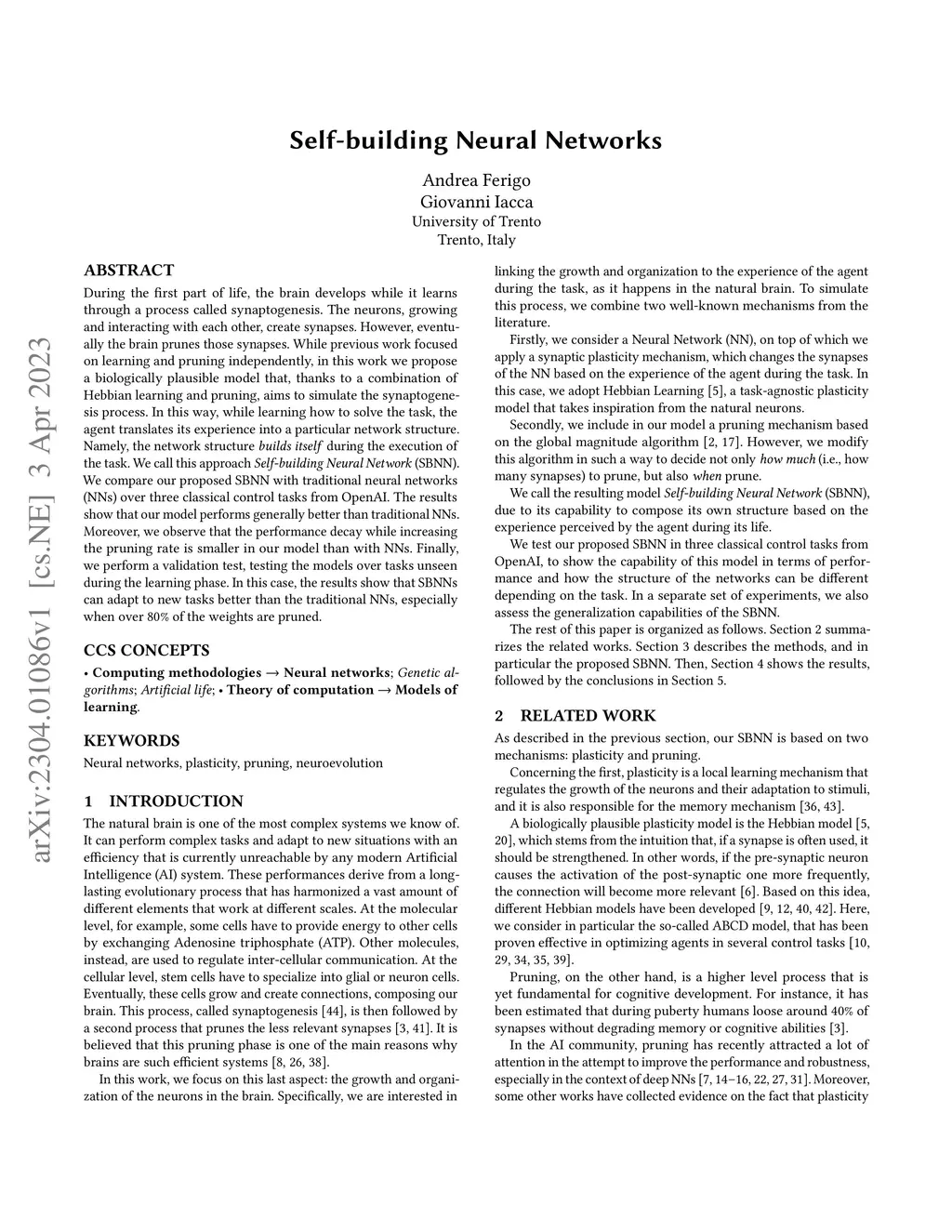 During the first part of life, the brain develops while it learns through a process called synaptogenesis. The neurons, growing and interacting with each other, create synapses. However, eventually the brain prunes those synapses. While previous work focused on learning and pruning independently, in this work we propose a biologically plausible model that, thanks to a combination of Hebbian learning and pruning, aims to simulate the synaptogenesis process. In this way, while learning how to solve the task, the agent translates its experience into a particular network structure. Namely, the network structure builds itself during the execution of the task. We call this approach Self-building Neural Network (SBNN). We compare our proposed SBNN with traditional neural networks (NNs) over three classical control tasks from OpenAI. The results show that our model performs generally better than traditional NNs. Moreover, we observe that the performance decay while increasing the pruning rate is smaller in our model than with NNs. Finally, we perform a validation test, testing the models over tasks unseen during the learning phase. In this case, the results show that SBNNs can adapt to new tasks better than the traditional NNs, especially when over of the weights are pruned.