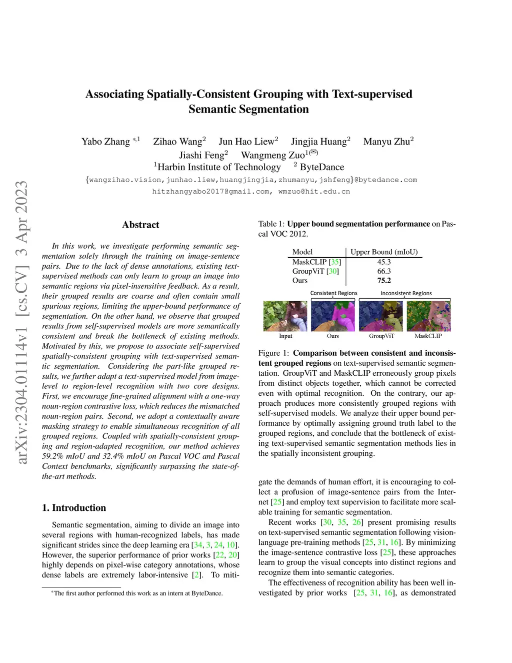 In this work, we investigate performing semantic segmentation solely through the training on image-sentence pairs. Due to the lack of dense annotations, existing text-supervised methods can only learn to group an image into semantic regions via pixel-insensitive feedback. As a result, their grouped results are coarse and often contain small spurious regions, limiting the upper-bound performance of segmentation. On the other hand, we observe that grouped results from self-supervised models are more semantically consistent and break the bottleneck of existing methods. Motivated by this, we introduce associate self-supervised spatially-consistent grouping with text-supervised semantic segmentation. Considering the part-like grouped results, we further adapt a text-supervised model from image-level to region-level recognition with two core designs. First, we encourage fine-grained alignment with a one-way noun-to-region contrastive loss, which reduces the mismatched noun-region pairs. Second, we adopt a contextually aware masking strategy to enable simultaneous recognition of all grouped regions. Coupled with spatially-consistent grouping and region-adapted recognition, our method achieves 59.2% mIoU and 32.4% mIoU on Pascal VOC and Pascal Context benchmarks, significantly surpassing the state-of-the-art methods.