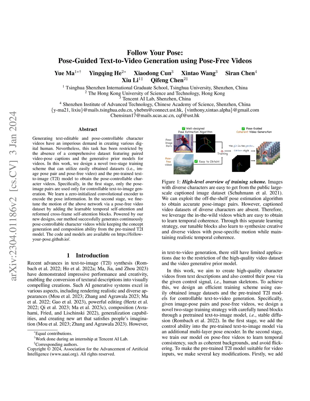 Generating text-editable and pose-controllable character videos have an imperious demand in creating various digital human. Nevertheless, this task has been restricted by the absence of a comprehensive dataset featuring paired video-pose captions and the generative prior models for videos. In this work, we design a novel two-stage training scheme that can utilize easily obtained datasets (i.e.,image pose pair and pose-free video) and the pre-trained text-to-image (T2I) model to obtain the pose-controllable character videos. Specifically, in the first stage, only the keypoint-image pairs are used only for a controllable text-to-image generation. We learn a zero-initialized convolutional encoder to encode the pose information. In the second stage, we finetune the motion of the above network via a pose-free video dataset by adding the learnable temporal self-attention and reformed cross-frame self-attention blocks. Powered by our new designs, our method successfully generates continuously pose-controllable character videos while keeps the editing and concept composition ability of the pre-trained T2I model. The code and models will be made publicly available.
