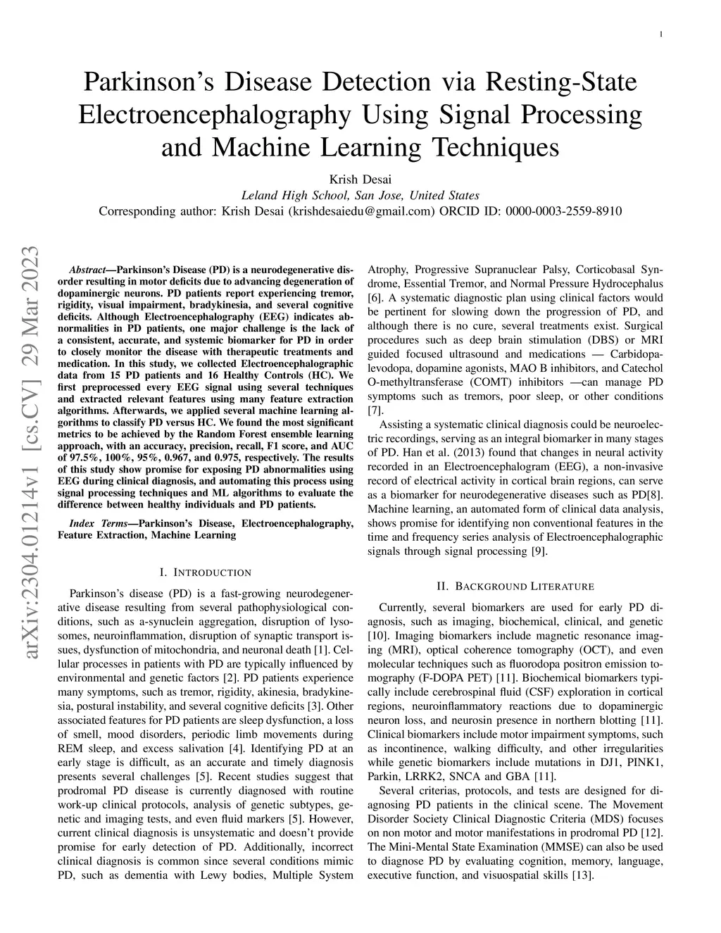 Parkinsons Disease Detection via Resting-State Electroencephalography