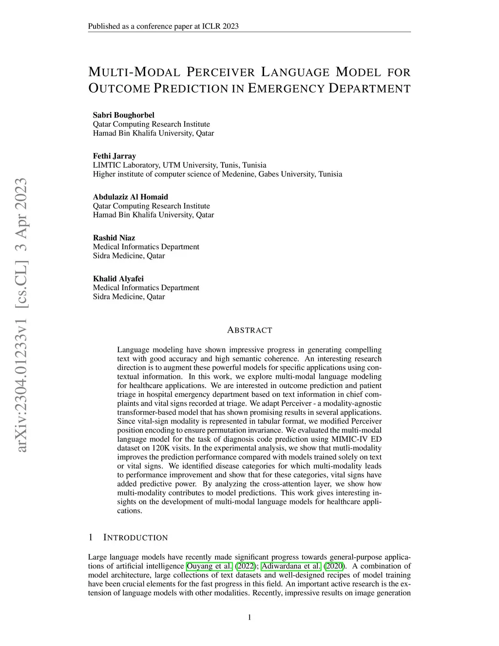 Multi-Modal Perceiver Language Model for Outcome Prediction in Emergency