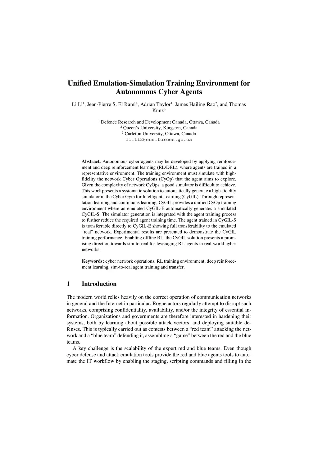 Unified Emulation-Simulation Training Environment for Autonomous Cyber