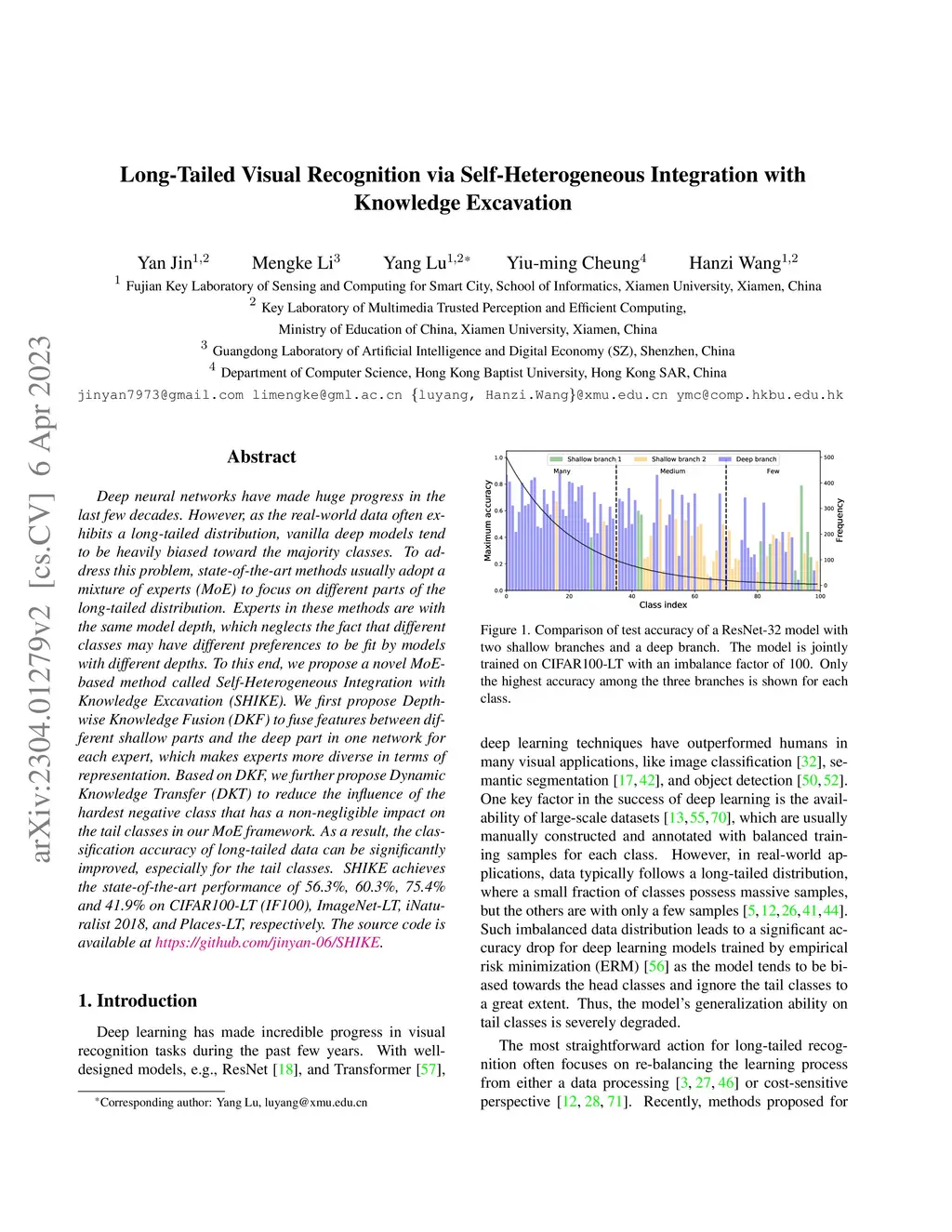 Deep neural networks have made huge progress in the last few decades. However, as the real-world data often exhibits a long-tailed distribution, vanilla deep models tend to be heavily biased toward the majority classes. To address this problem, state-of-the-art methods usually adopt a mixture of experts (MoE) to focus on different parts of the long-tailed distribution. Experts in these methods are with the same model depth, which neglects the fact that different classes may have different preferences to be fit by models with different depths. To this end, we propose a novel MoE-based method called Self-Heterogeneous Integration with Knowledge Excavation (SHIKE). We first propose Depth-wise Knowledge Fusion (DKF) to fuse features between different shallow parts and the deep part in one network for each expert, which makes experts more diverse in terms of representation. Based on DKF, we further propose Dynamic Knowledge Transfer (DKT) to reduce the influence of the hardest negative class that has a non-negligible impact on the tail classes in our MoE framework. As a result, the classification accuracy of long-tailed data can be significantly improved, especially for the tail classes. SHIKE achieves the state-of-the-art performance of 56.3%, 60.3%, 75.4%, and 41.9% on CIFAR100-LT (IF100), ImageNet-LT, iNaturalist 2018, and Places-LT, respectively.