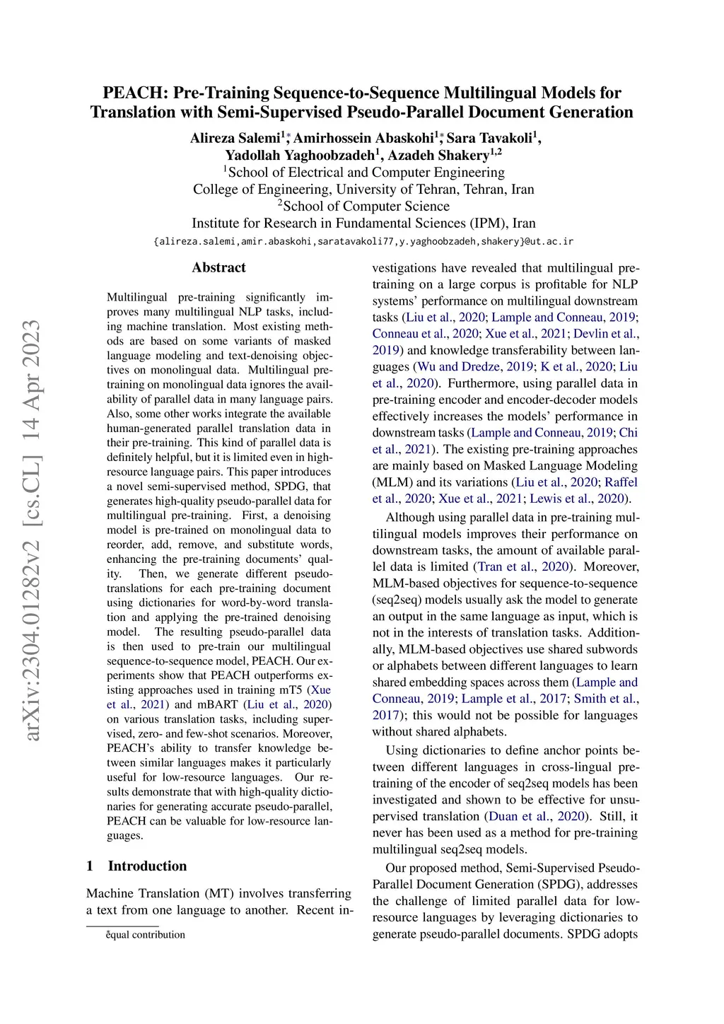 Multilingual pre-training significantly improves many multilingual NLP tasks, including machine translation. Most existing methods are based on some variants of masked language modeling and text-denoising objectives on monolingual data. Multilingual pre-training on monolingual data ignores the availability of parallel data in many language pairs. Also, some other works integrate the available human-generated parallel translation data in their pre-training. This kind of parallel data is definitely helpful, but it is limited even in high-resource language pairs. This paper introduces a novel semi-supervised method, SPDG, that generates high-quality pseudo-parallel data for multilingual pre-training. First, a denoising model is pre-trained on monolingual data to reorder, add, remove, and substitute words, enhancing the pre-training documents' quality. Then, we generate different pseudo-translations for each pre-training document using dictionaries for word-by-word translation and applying the pre-trained denoising model. The resulting pseudo-parallel data is then used to pre-train our multilingual sequence-to-sequence model, PEACH. Our experiments show that PEACH outperforms existing approaches used in training mT5 and mBART on various translation tasks, including supervised, zero- and few-shot scenarios. Moreover, PEACH's ability to transfer knowledge between similar languages makes it particularly useful for low-resource languages. Our results demonstrate that with high-quality dictionaries for generating accurate pseudo-parallel, PEACH can be valuable for low-resource languages.