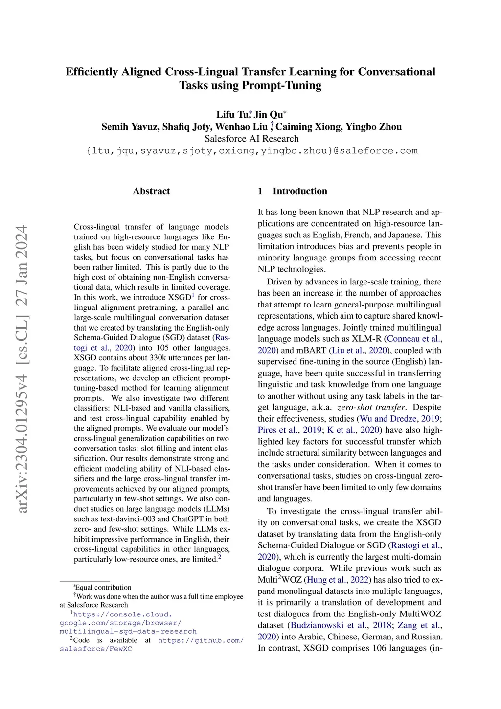 Cross-lingual transfer of language models trained on high-resource languages like English has been widely studied for many NLP tasks, but focus on conversational tasks has been rather limited. This is partly due to the high cost of obtaining non-English conversational data, which results in limited coverage. In this work, we introduce XSGD for cross-lingual alignment pretraining, a parallel and large-scale multilingual conversation dataset that we created by translating the English-only Schema-Guided Dialogue (SGD) dataset (Rastogi et al., 2020) into 105 other languages. XSGD contains approximately 330k utterances per language. To facilitate aligned cross-lingual representations, we develop an efficient prompt-tuning-based method for learning alignment prompts. We also investigate two different classifiers: NLI-based and vanilla classifiers, and test cross-lingual capability enabled by the aligned prompts. We evaluate our model's cross-lingual generalization capabilities on two conversation tasks: slot-filling and intent classification. Our results demonstrate the strong and efficient modeling ability of NLI-based classifiers and the large cross-lingual transfer improvements achieved by our aligned prompts, particularly in few-shot settings. In addition, we highlight the nice results of our approach compared to LLMs such as text-davinci-003 and ChatGPT in both zero-shot and few-shot settings. While LLMs exhibit impressive performance in English, their cross-lingual capabilities in other languages, particularly low-resource languages, are limited.