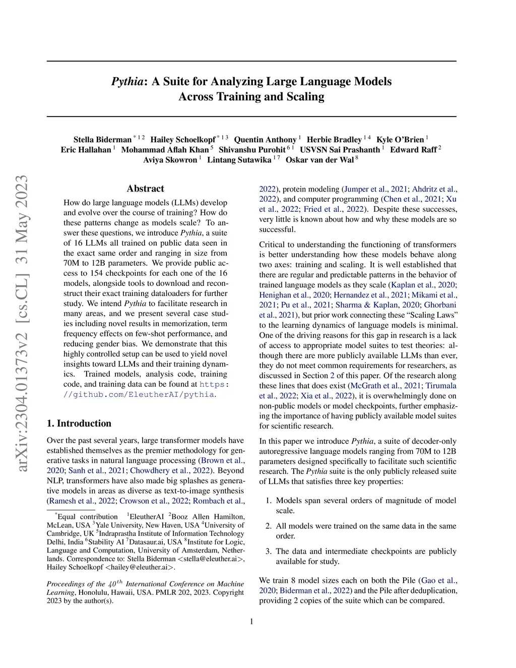 How do large language models (LLMs) develop and evolve over the course of training? How do these patterns change as models scale? To answer these questions, we introduce \textit{Pythia}, a suite of 16 LLMs all trained on public data seen in the exact same order and ranging in size from 70M to 12B parameters. We provide public access to 154 checkpoints for each one of the 16 models, alongside tools to download and reconstruct their exact training dataloaders for further study. We intend \textit{Pythia} to facilitate research in many areas, and we present several case studies including novel results in memorization, term frequency effects on few-shot performance, and reducing gender bias. We demonstrate that this highly controlled setup can be used to yield novel insights toward LLMs and their training dynamics. Trained models, analysis code, training code, and training data can be found at \url{https://github.com/EleutherAI/pythia}.