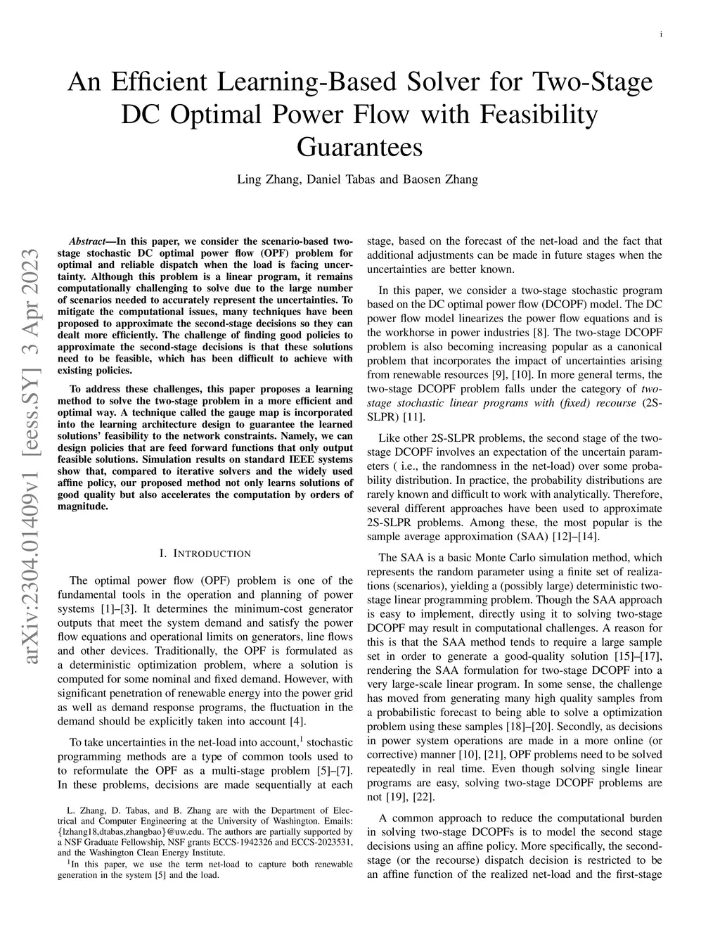 In this paper, we consider the scenario-based two-stage stochastic DC optimal power flow (OPF) problem for optimal and reliable dispatch when the load is facing uncertainty. Although this problem is a linear program, it remains computationally challenging to solve due to the large number of scenarios needed to accurately represent the uncertainties. To mitigate the computational issues, many techniques have been proposed to approximate the second-stage decisions so they can dealt more efficiently. The challenge of finding good policies to approximate the second-stage decisions is that these solutions need to be feasible, which has been difficult to achieve with existing policies. To address these challenges, this paper proposes a learning method to solve the two-stage problem in a more efficient and optimal way. A technique called the gauge map is incorporated into the learning architecture design to guarantee the learned solutions' feasibility to the network constraints. Namely, we can design policies that are feed forward functions that only output feasible solutions. Simulation results on standard IEEE systems show that, compared to iterative solvers and the widely used affine policy, our proposed method not only learns solutions of good quality but also accelerates the computation by orders of magnitude.
