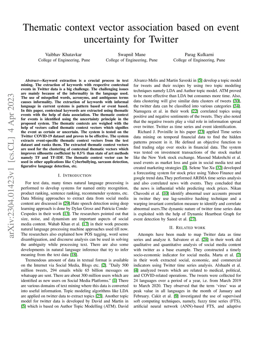 Keyword extraction is a crucial process in text mining. The extraction of keywords with respective contextual events in Twitter data is a big challenge. The challenging issues are mainly because of the informality in the language used. The use of misspelled words, acronyms, and ambiguous terms causes informality. The extraction of keywords with informal language in current systems is pattern based or event based. In this paper, contextual keywords are extracted using thematic events with the help of data association. The thematic context for events is identified using the uncertainty principle in the proposed system. The thematic contexts are weighed with the help of vectors called thematic context vectors which signifies the event as certain or uncertain. The system is tested on the Twitter COVID-19 dataset and proves to be effective. The system extracts event-specific thematic context vectors from the test dataset and ranks them. The extracted thematic context vectors are used for the clustering of contextual thematic vectors which improves the silhouette coefficient by 0.5% than state of art methods namely TF and TF-IDF. The thematic context vector can be used in other applications like Cyberbullying, sarcasm detection, figurative language detection, etc.